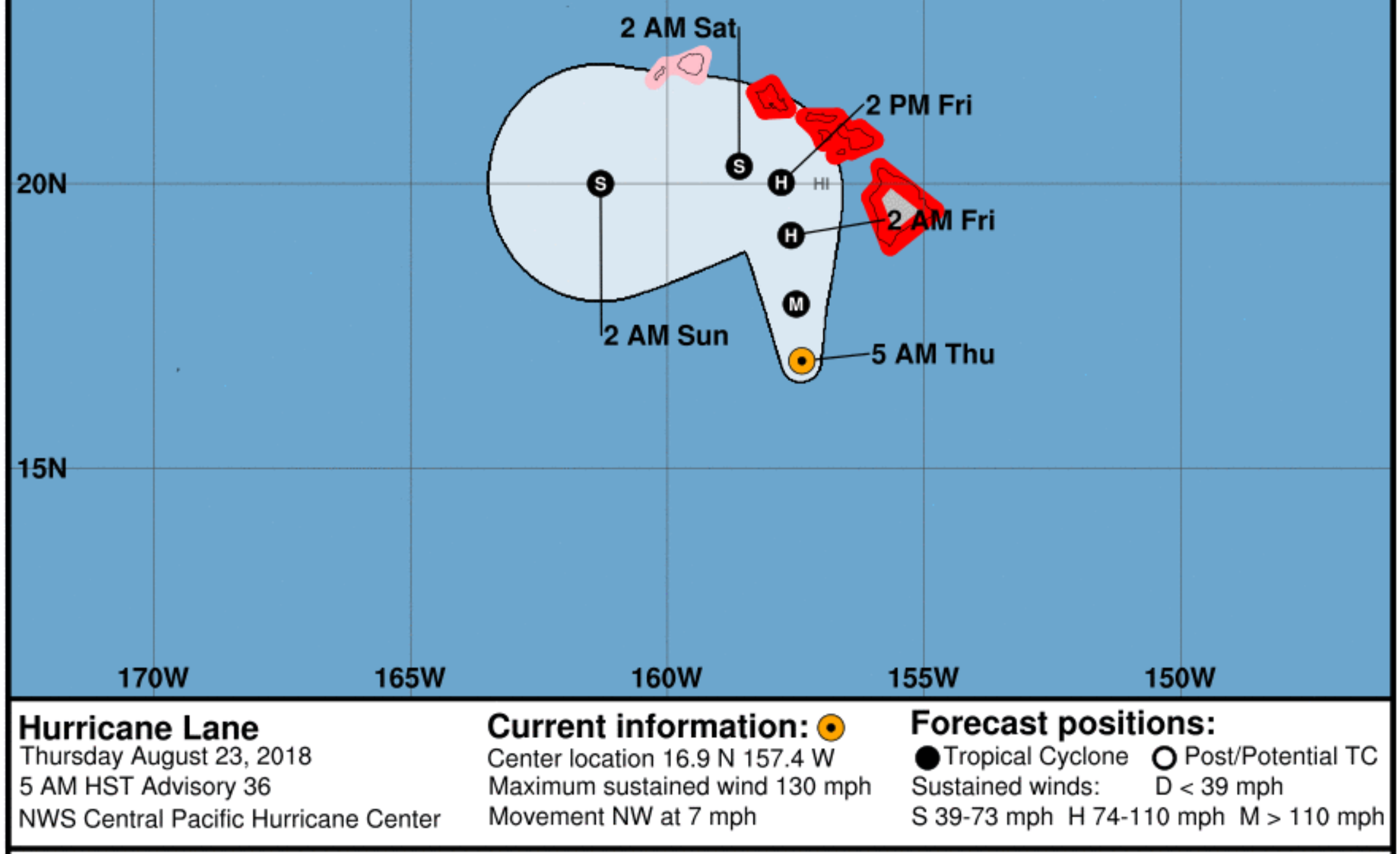 As of the 11:00am ET (5:00am Hawaiian) Central Pacific Hurricane Center advisory, Hurricane Lane has maintained its 130mph top sustained wind speed — keeping it barely a Category 4 hurricane. A hurricane warning is active for the islands of Oahu, Maui, Lanai, Molokai, Kahoolawe and the Big Island.