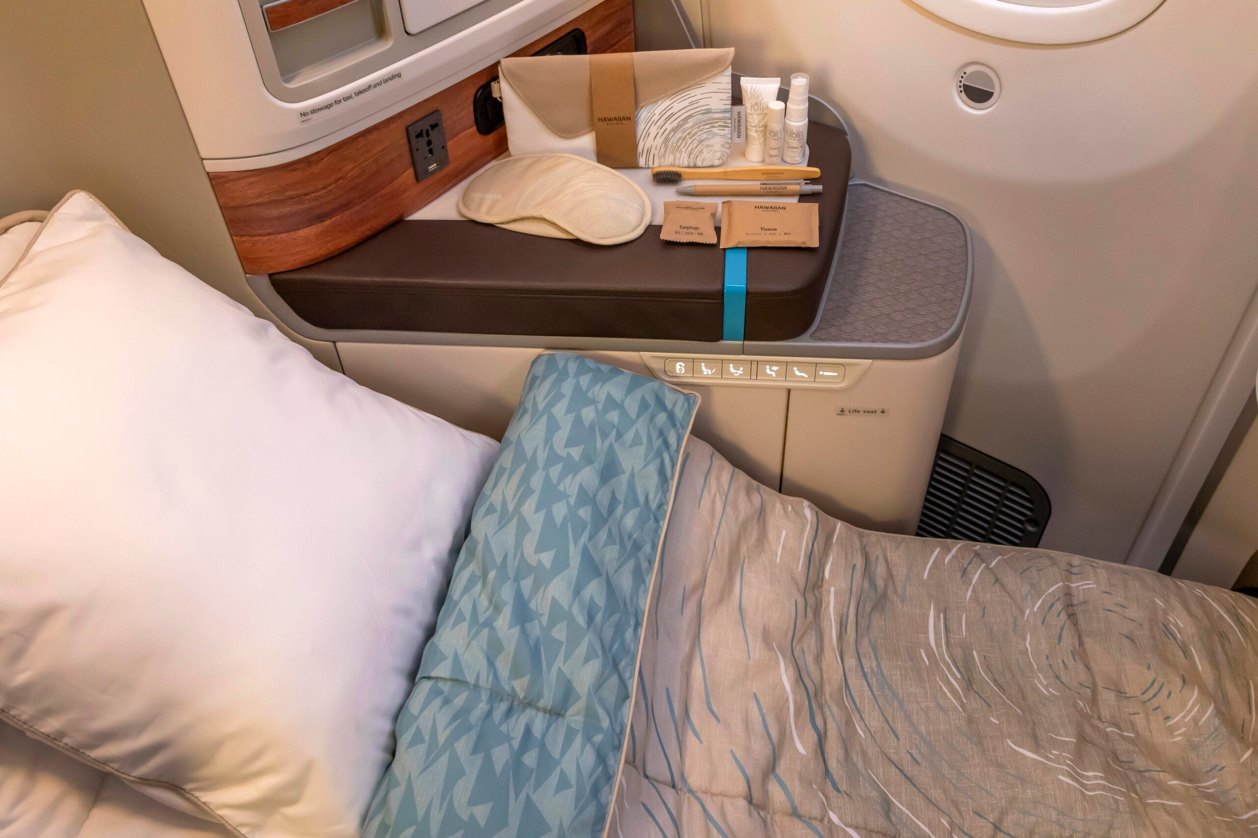 Starting Nov. 6, business-class travelers will be treated to kits that include sleep masks, toothbrushes, pens, earplugs and tissues, along with toiletries like lip balm in a cream-colored canvas bag. Business-class seats will also feature a blanket, mattress pad and pillow.
