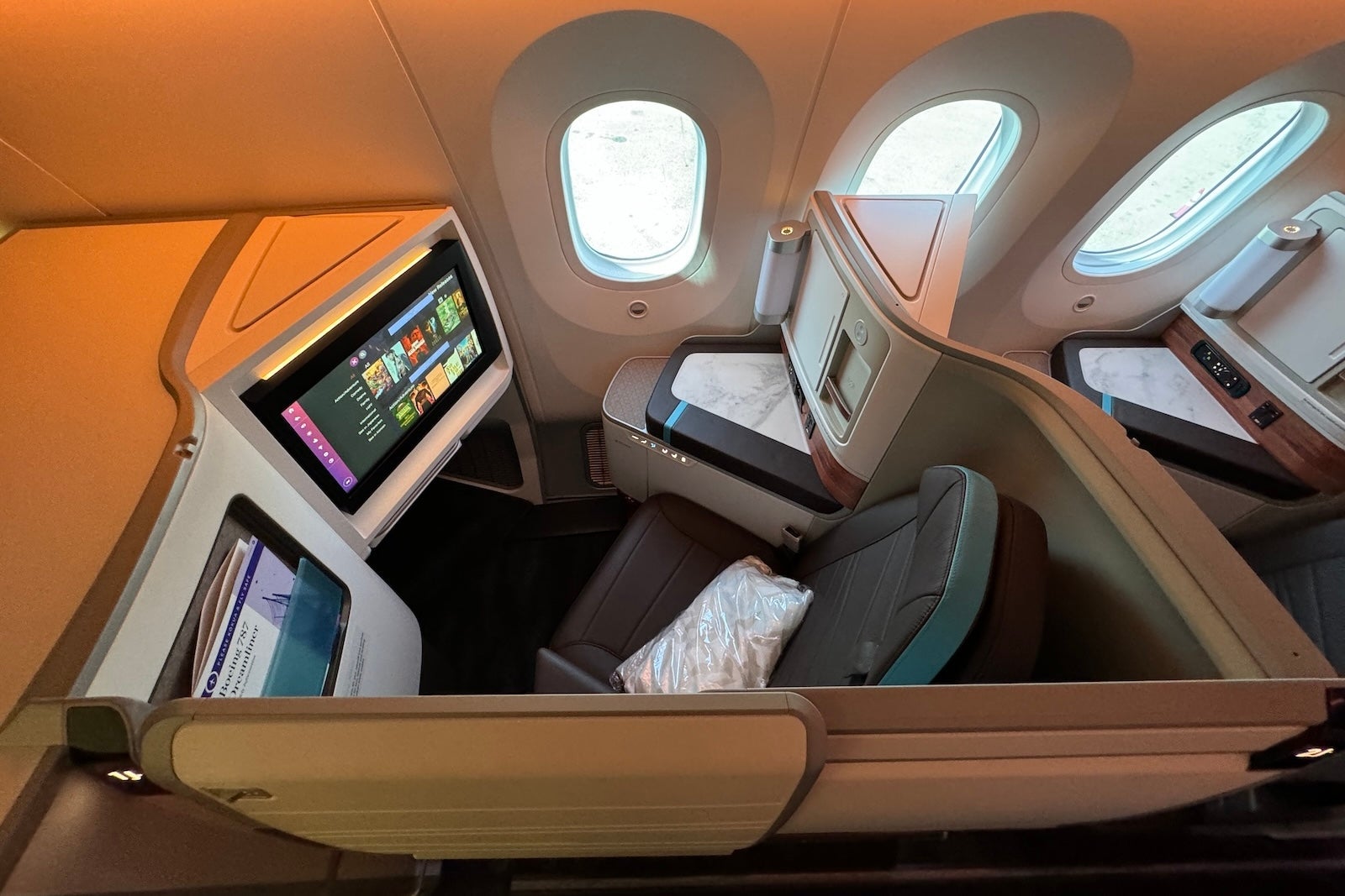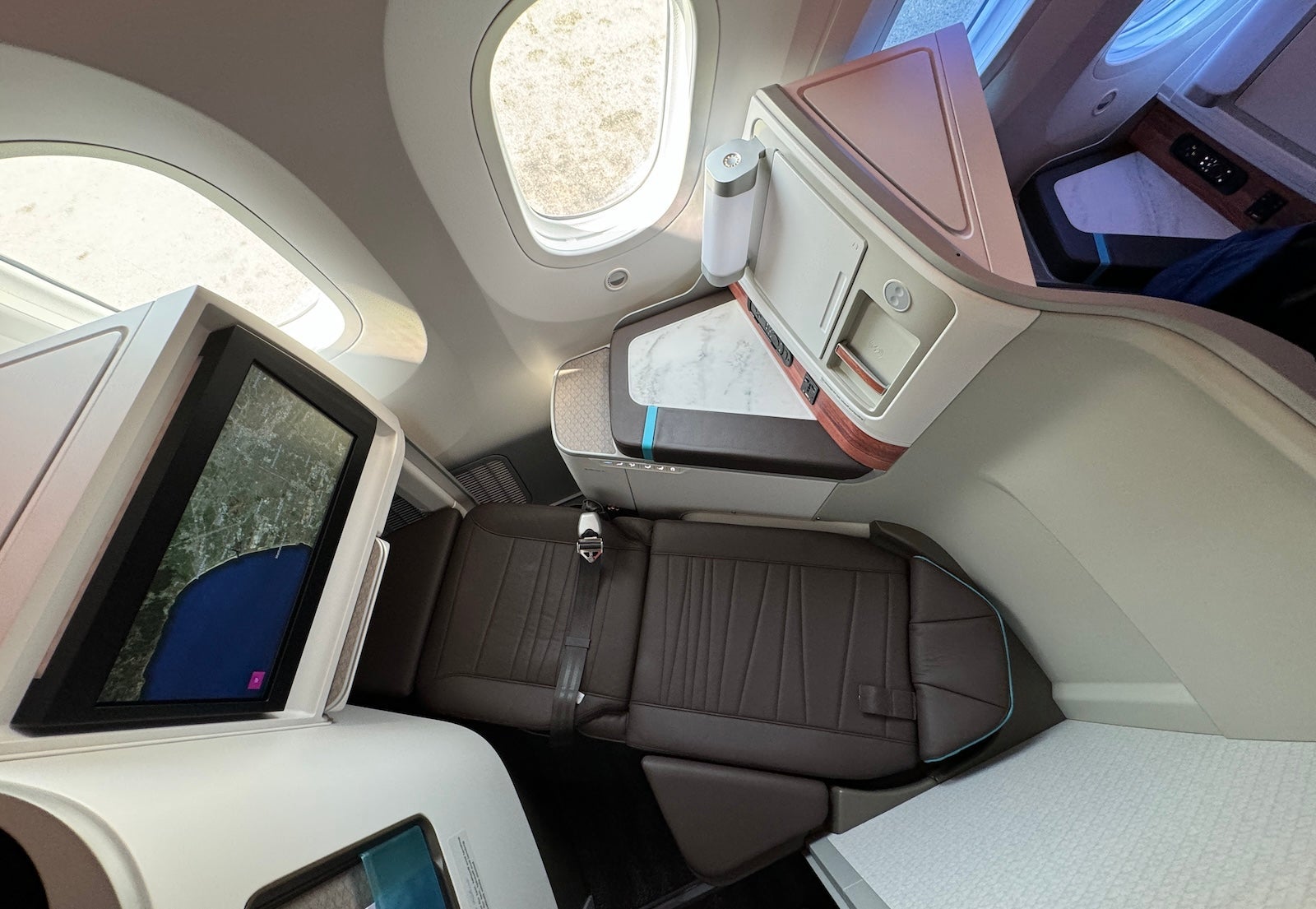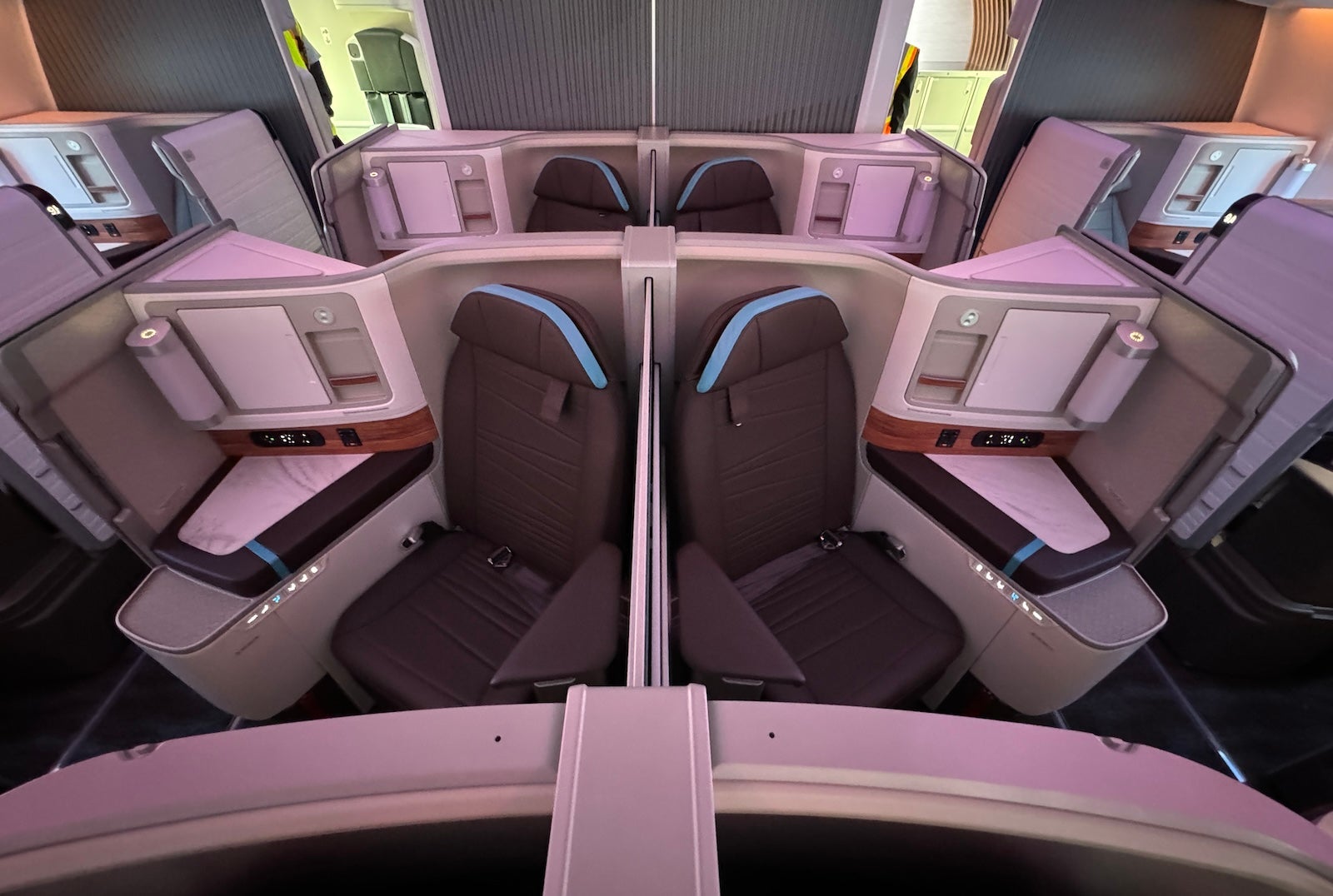 Seats in the middle section, however, have their headrests and backrests next to one another and are angled out toward the aisle. There are tiered privacy dividers between them that can be raised above eye level or lowered all the way to seat level for passengers traveling together who want to create a more intimate shared space. To manipulate them, you can use electronic buttons, and to lower them, both passengers need to press the down arrow at the same time.