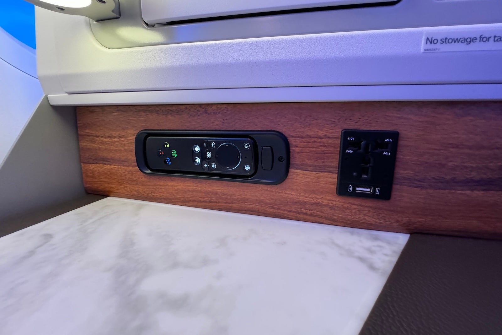 Along their larger, aisle-side armrests, seats have dual-level surfaces (a wider one for devices and a narrower shelf for beverages), handheld remotes for the entertainment systems and a set of controls to maneuver the seats into various positions, including upright for takeoff and landing, lounging positions and lie-flat bed mode.