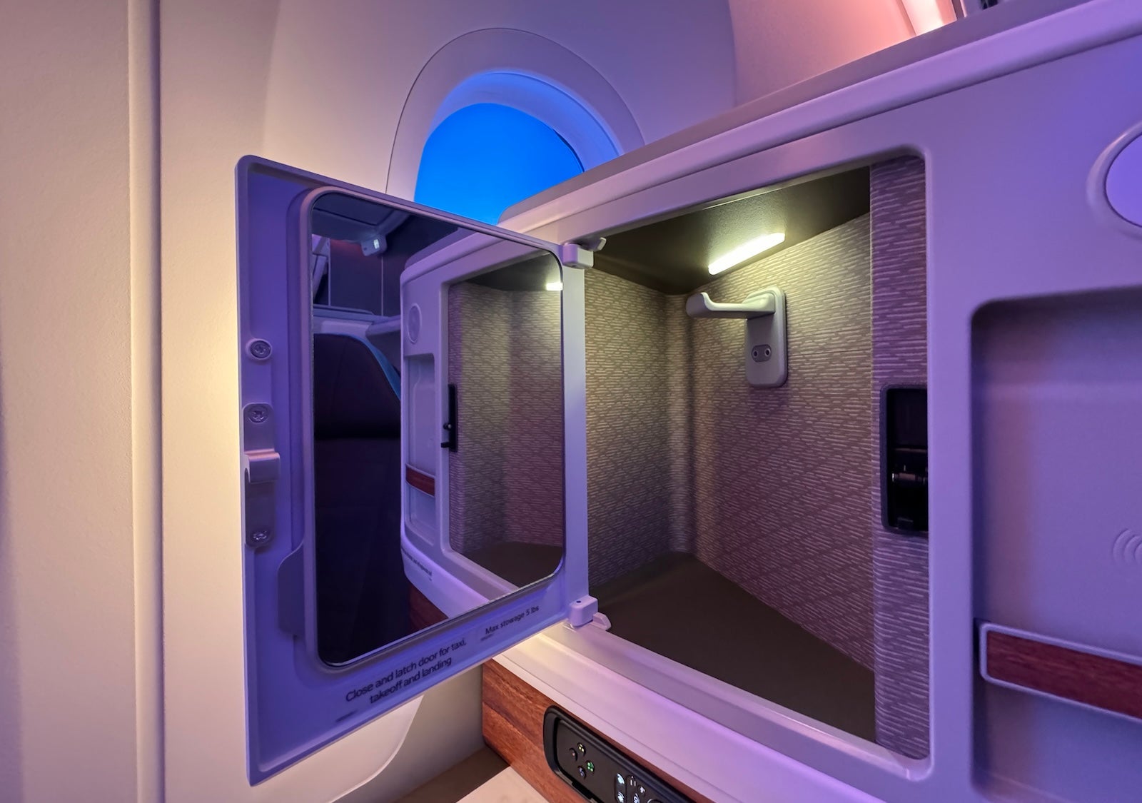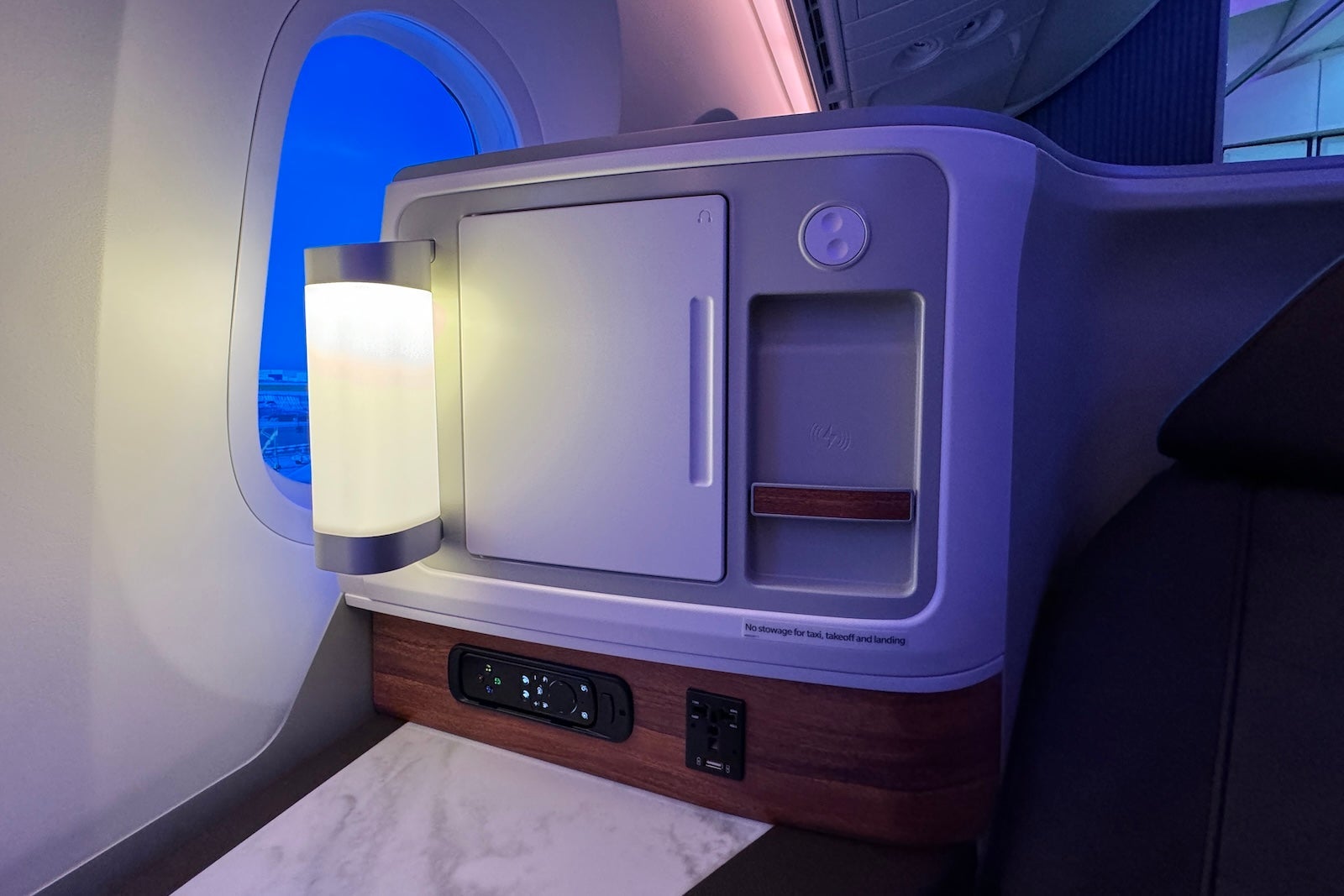 These seats have plenty more storage than their predecessors. Their seat-side cupboards have adjustable interior mirrors and enough space to stow headphones and amenity kits. Just to the side, there is a little rack with an extendable bar for stowing a phone, which is also handy since this is a Qi wireless charging surface.