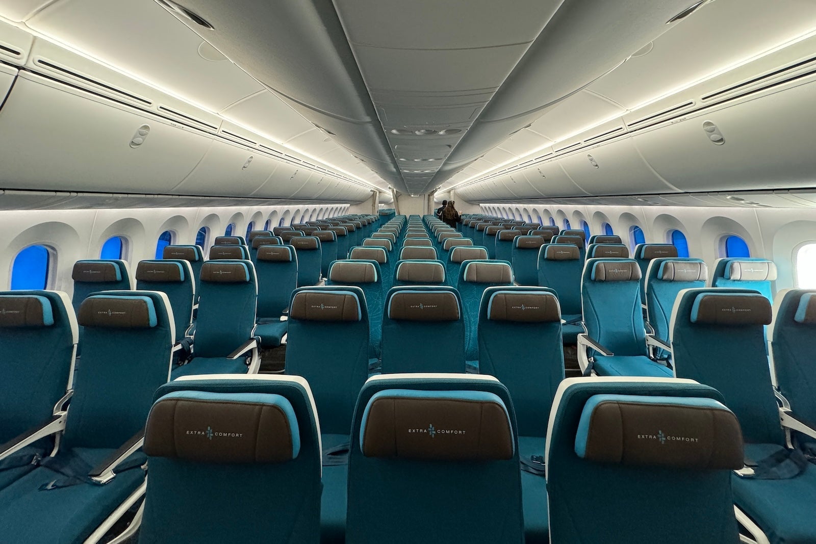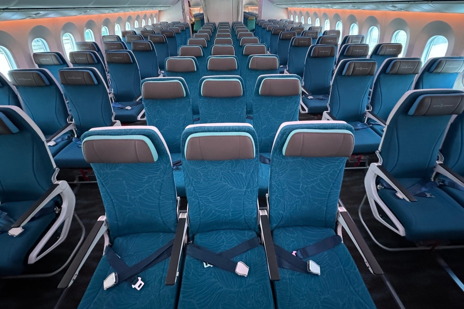 Hawaiian Airlines' Boeing 787-9 economy section comprises a total of 266 seats, 79 of which — mostly located along the sides in the forward section and the first row of the aft section — are designated as Extra Comfort.