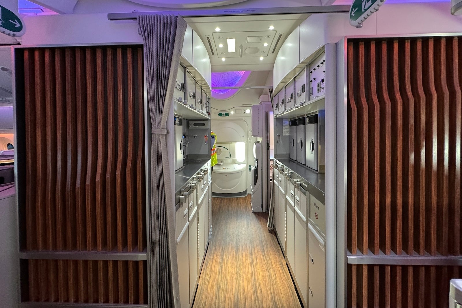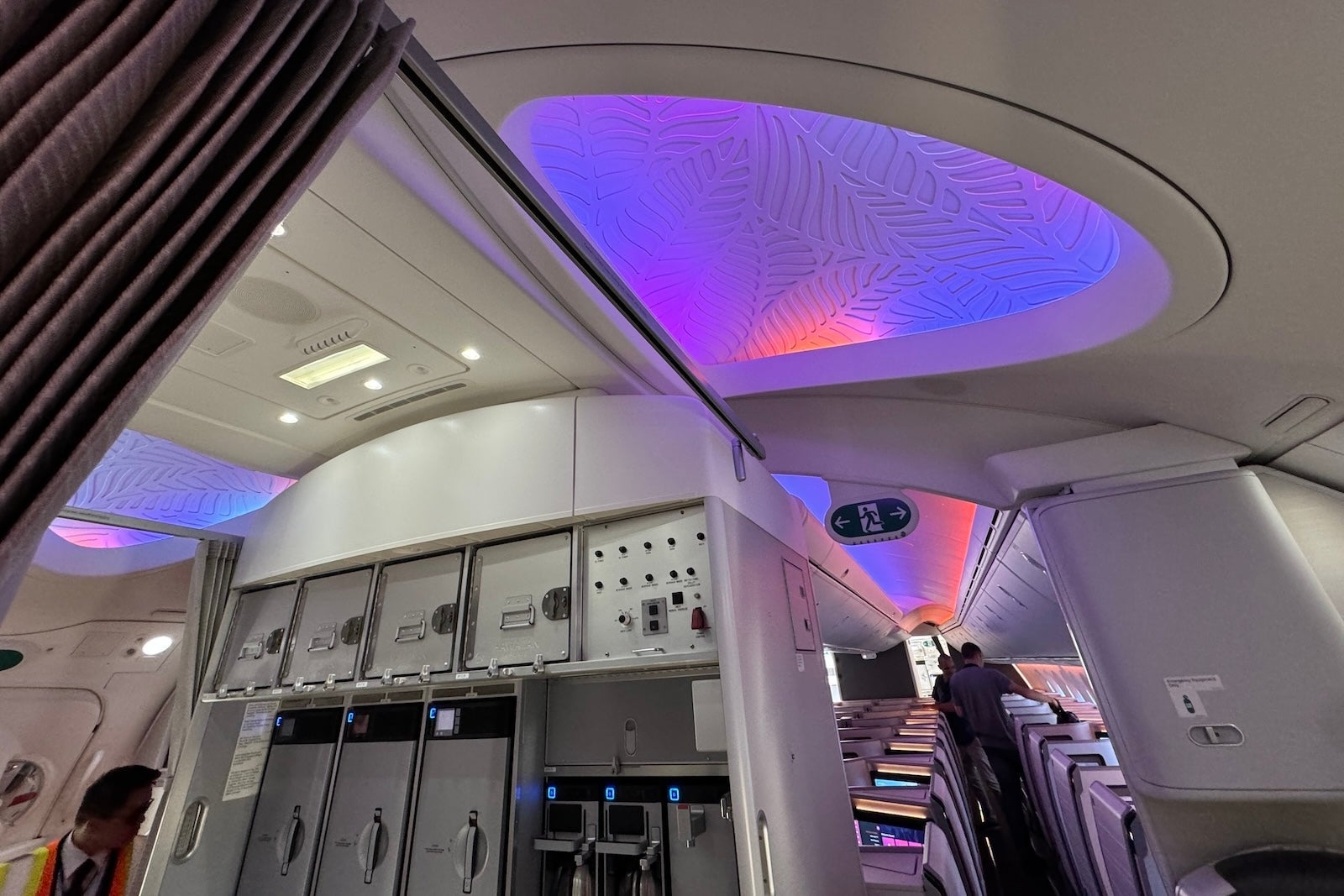Perceptive passengers will notice a few other Hawaiian-specific features board the airline's Boeing 787-9s, including an entry area near door 2L with wooden slats inspired by native Hawaiian hardwood that resembles the ribbing of an outrigger canoe, leaf-like texturing along the ceiling panels and purple lighting reminiscent of the islands' tropical flora.