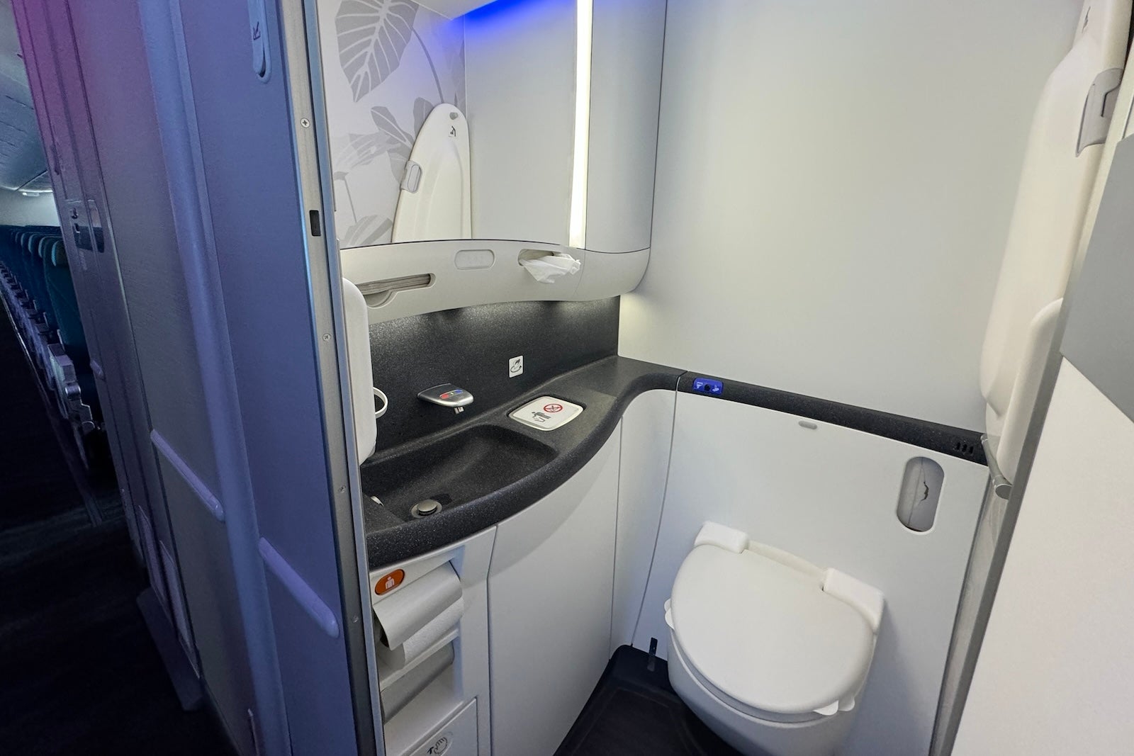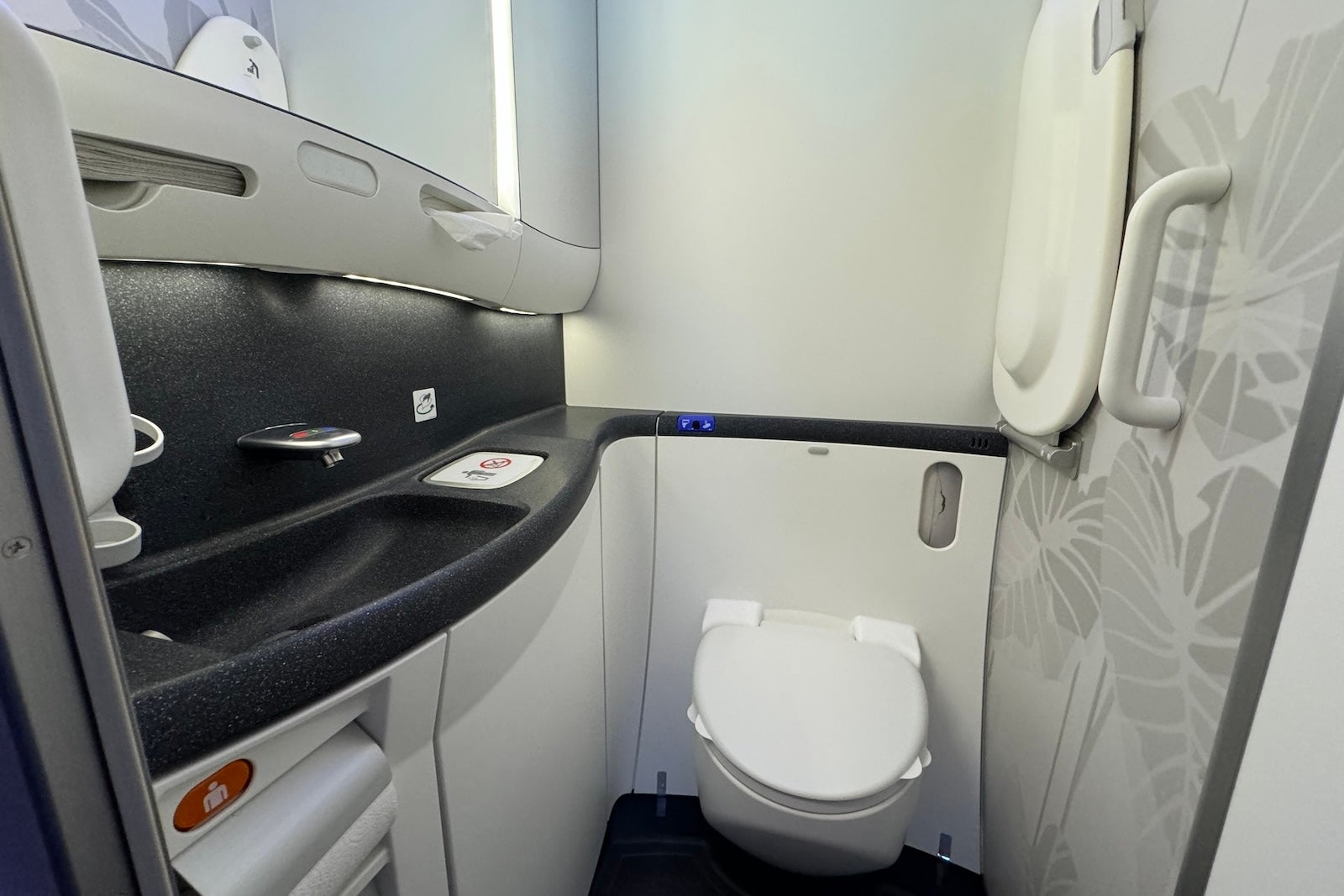 There are just two lavatories for the cabin, one at the front near the forward galley and one by the aft galley. Both have sleek finishes and current hygienic features, including touch-free sinks and toilet flushing.