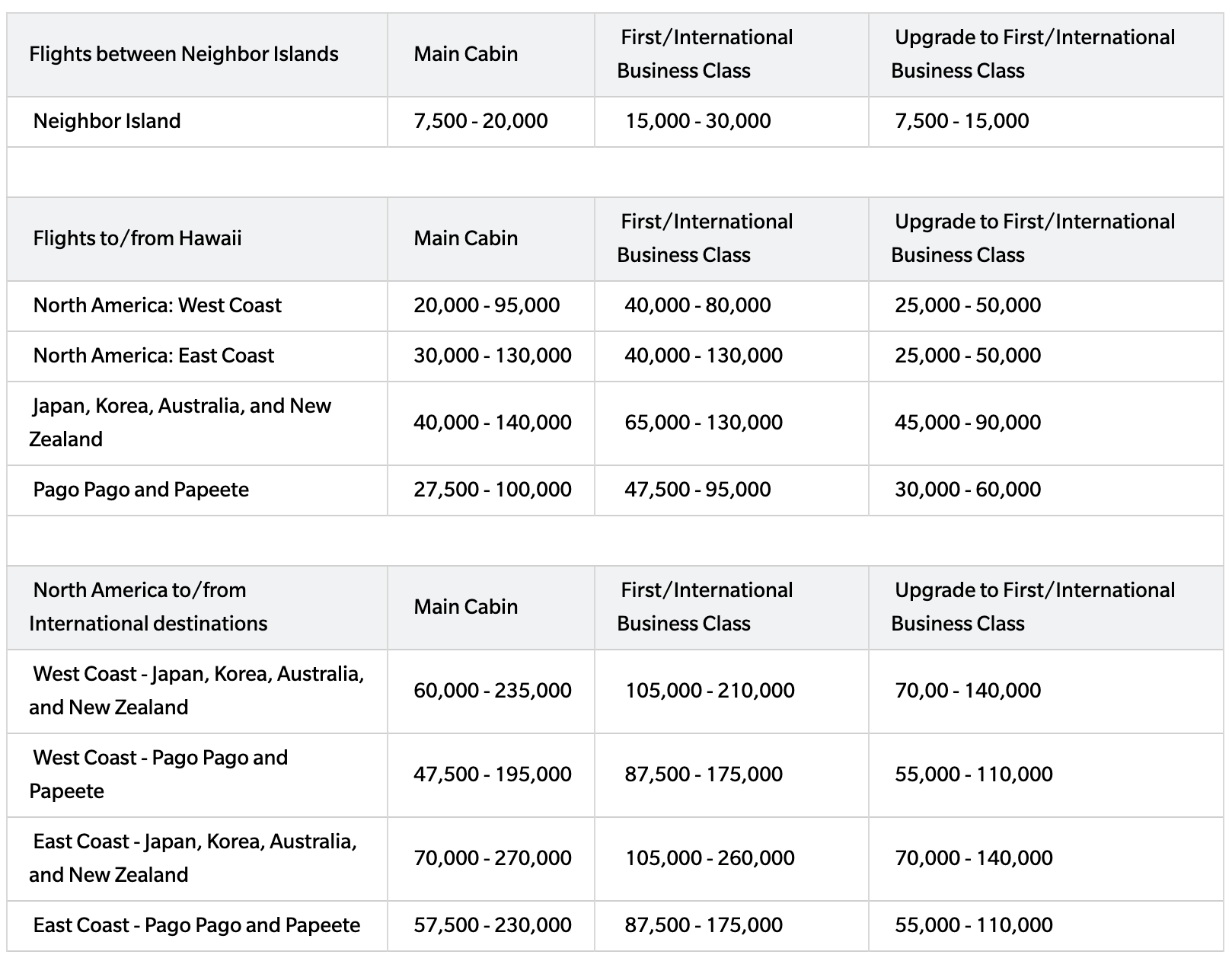 While the lower end of these awards remain the same, the higher end has jumped by 58%! Business class awards are technically a bit cheaper now, as the high end of the range has dropped from 130,000 miles to 80,000 miles, though that's still an incredibly poor value for a relatively short flight to the Aloha State.