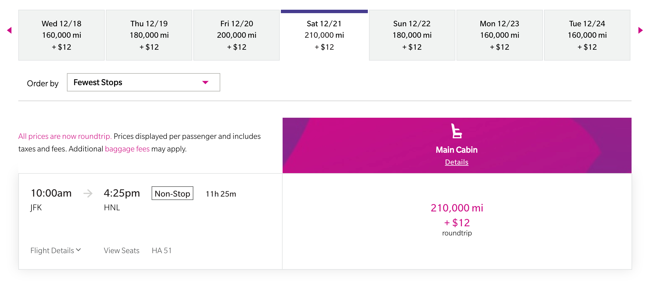 This shift to different pricing from the East Coast is a major change, as the lowest-priced awards have jumped 50% as a result. But note that the high end of the range has more than doubled. This essentially gives Hawaiian the ability to price awards wherever it wants, like this round-trip from JFK-HNL over the Christmas holidays:
