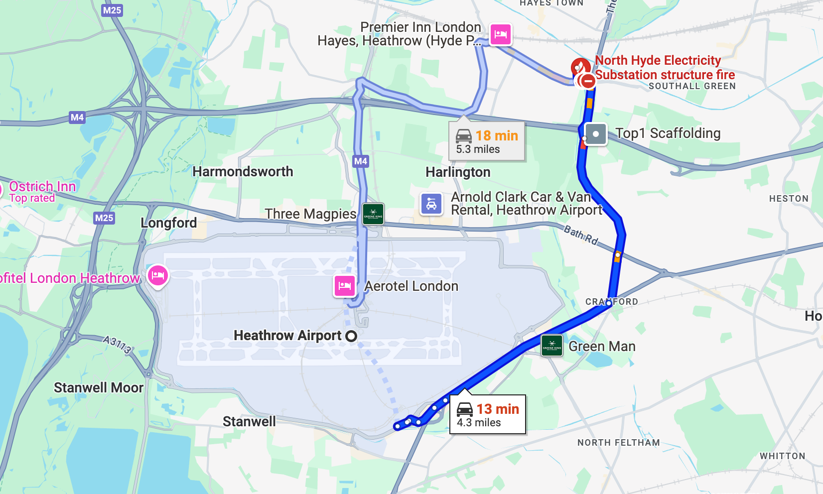 The London Fire Brigade received an alert at 11:23 p.m. GMT about a fire at an electrical substation operated by the National Grid in nearby Hayes; the fire involved a transformer that was alight. The substation is approximately 5 miles and just a 15-minute drive from Heathrow Airport.