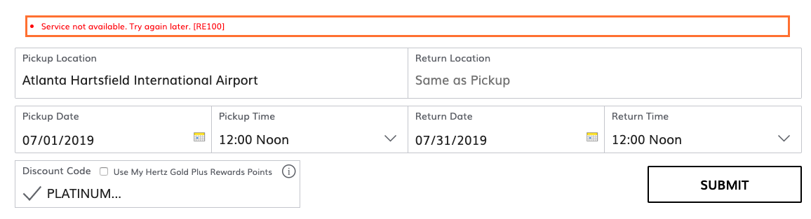 Ironically, Hertz's website routinely produced an error when attempting to book a monthlong reservation.