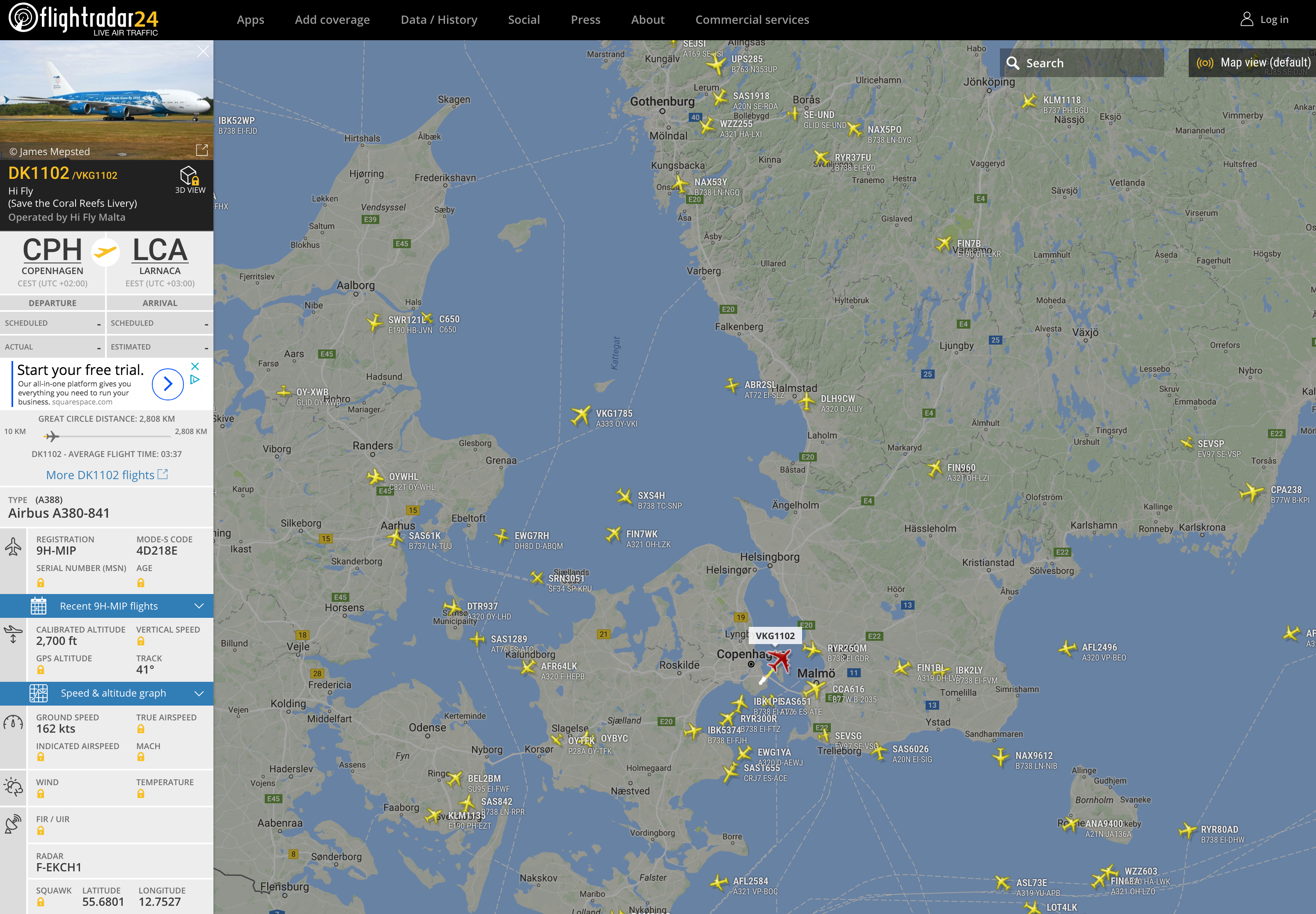 On Wednesday, Hi Fly's first A380 — registration 9H-MIP — took off to position from Beja (BYJ) to Copenhagen (CPH), landing just after 6:00am local time. Later Wednesday, the Hi Fly A380 will carry its first revenue passengers on a charter flight from CPH to Larnaca, Cyprus (LCA) — flight DK1102.