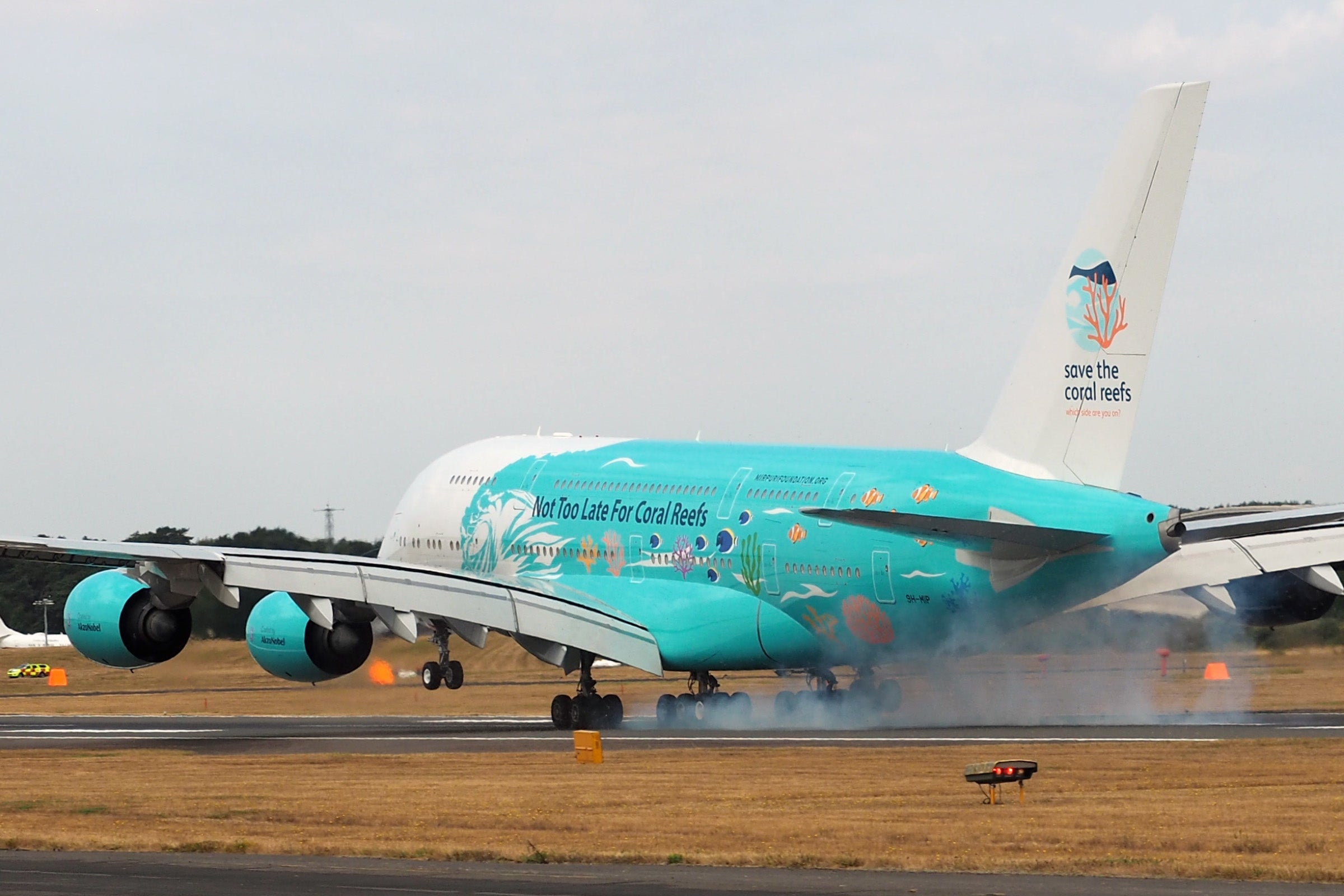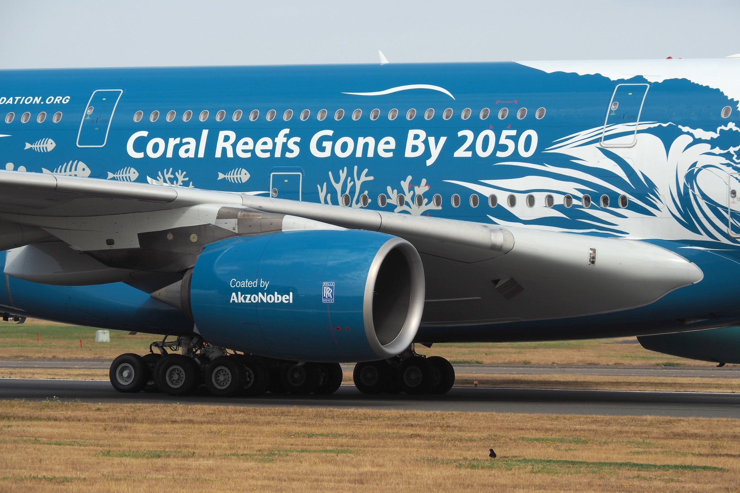 The livery and aircraft are supporting the carrier's Mirpuri Foundation, and its campaign to "Save the Coral Reefs." The plane has a slightly different color and design on each side.