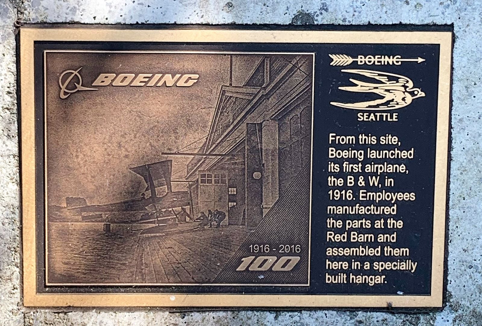 Easy to miss on the low wall along the park's stone walkway is a bronze plaque that reads, in part, "From this site, Boeing launched its first airplane, the B&W, in 1916."