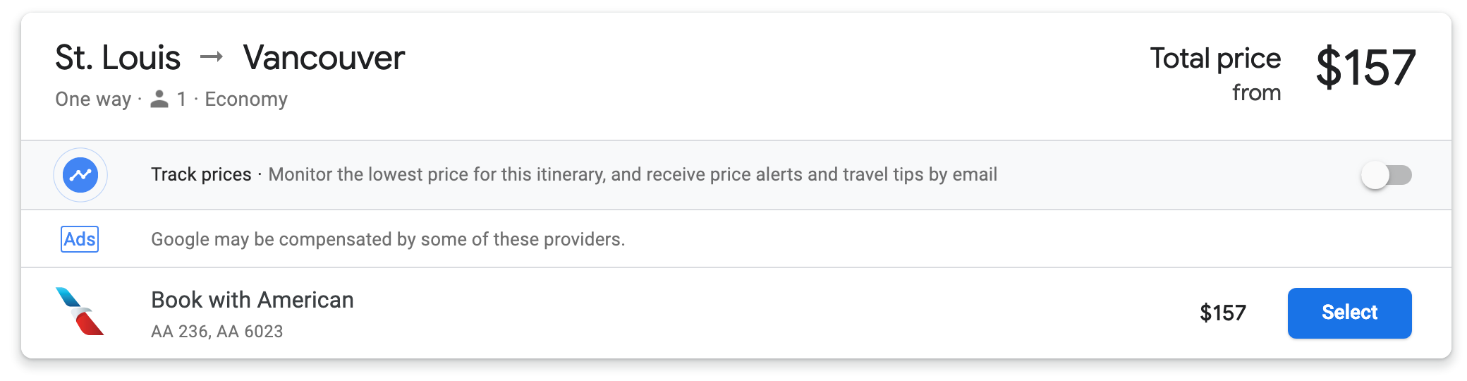 - One the same day, American Airlines is also selling a one-way ticket from St. Louis to Vancouver (YVR) with one stop in Los Angeles for just $157