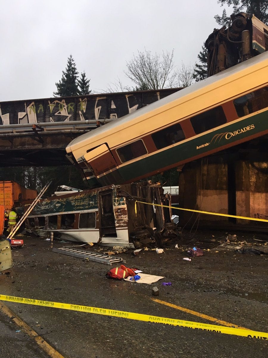 Images of the accident showed train cars hanging off the bridge onto I-5, which was closed off to traffic in both directions. Traffic on both sides was backed up at least three miles, according to the Seattle Times.