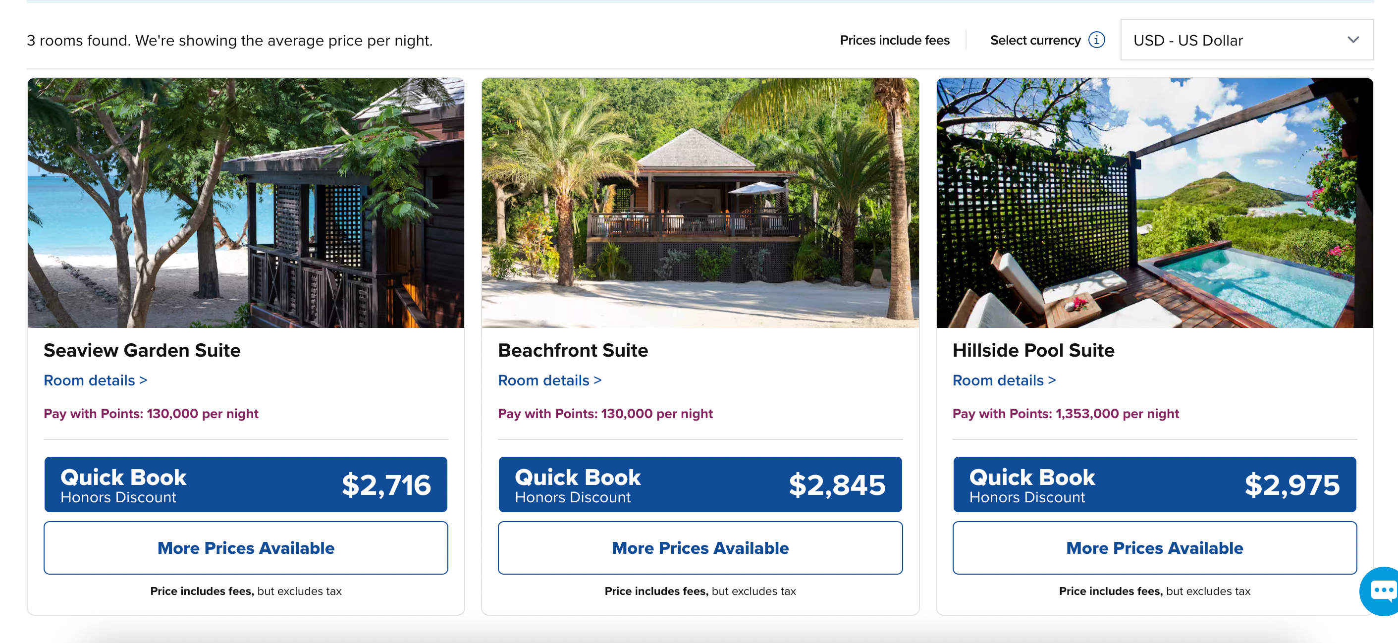 If you want to book SLH properties with Hilton Honors points, Hilton is pricing at standard award rates, which means "standard" rooms are capped at a certain number of points. For example, you can currently book a beachfront suite at Hermitage Bay, a luxury all-inclusive in Antigua, for 130,000 points per night. If you were to pay cash for this suite, it would cost $2,845. Therefore, you're getting about 2 cents per Hilton Honors point, which is a great value.