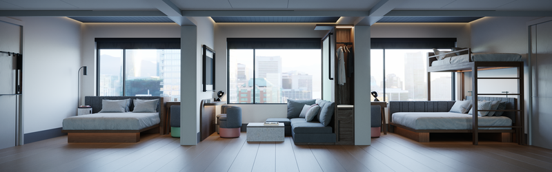 Inside each of the rooms, expect to find space-saving features like wall-beds, lofted beds, segmented showers and toilet stalls. Much inspired by boutique hostels, which Hilton noticed was a trend and an under-serviced segment in its portfolio, it's also giving travelers the option to create a hostel-like vibe — especially if you're traveling with a group.