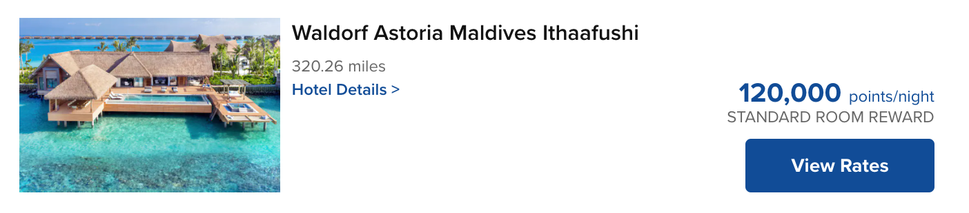 And if you want to get a big boost on your Hilton Honors points balances, it might be worth it to look into the Hilton Honors American Express Aspire Card. The current welcome offer is 150,000 Hilton Honors points after spending $4,000 in purchases within the first three months of card membership which would get you one night at the Maldives Waldorf.