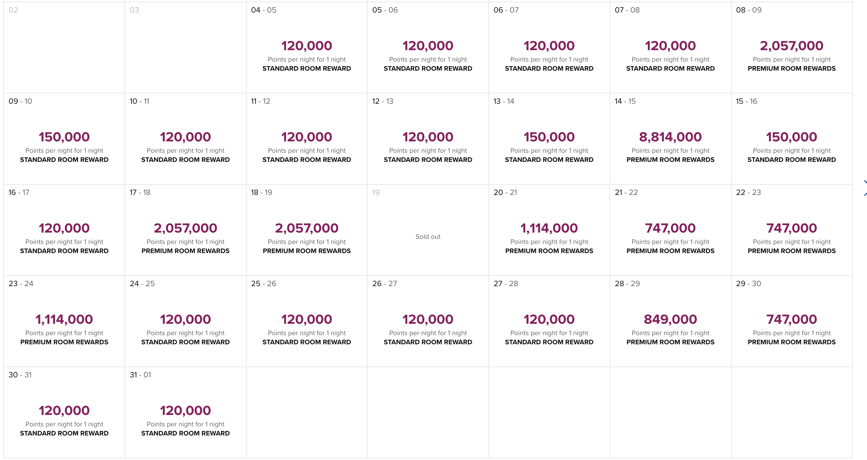 As you can imagine, it's not an easy property to find standard awards availability. I found some nights in the next month available at the standard level, but very little for the next year. As you can see from the search results below, 150,000 is noted as a "standard room reward" when the inventory is available on May 9, 13 and 15.