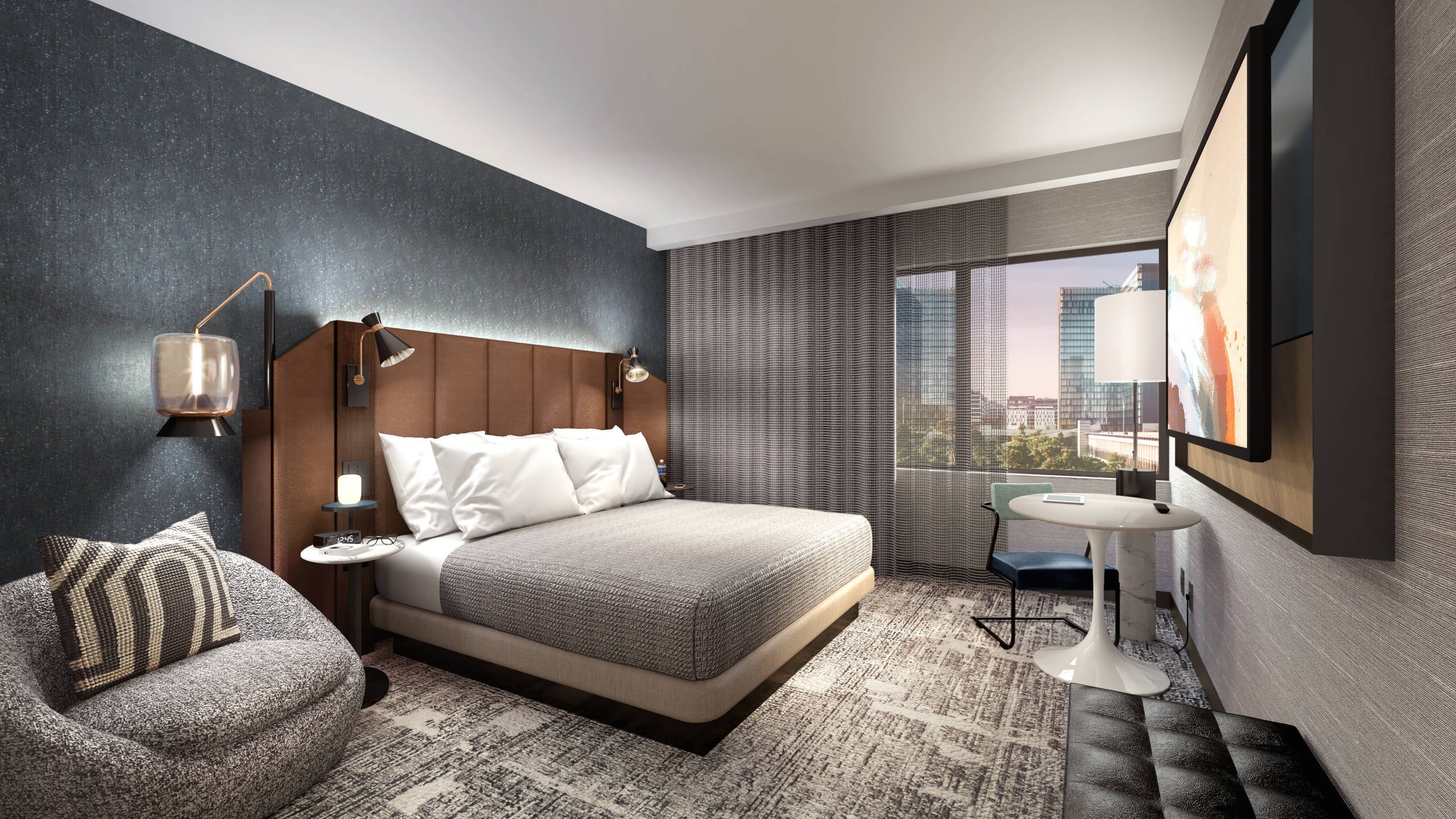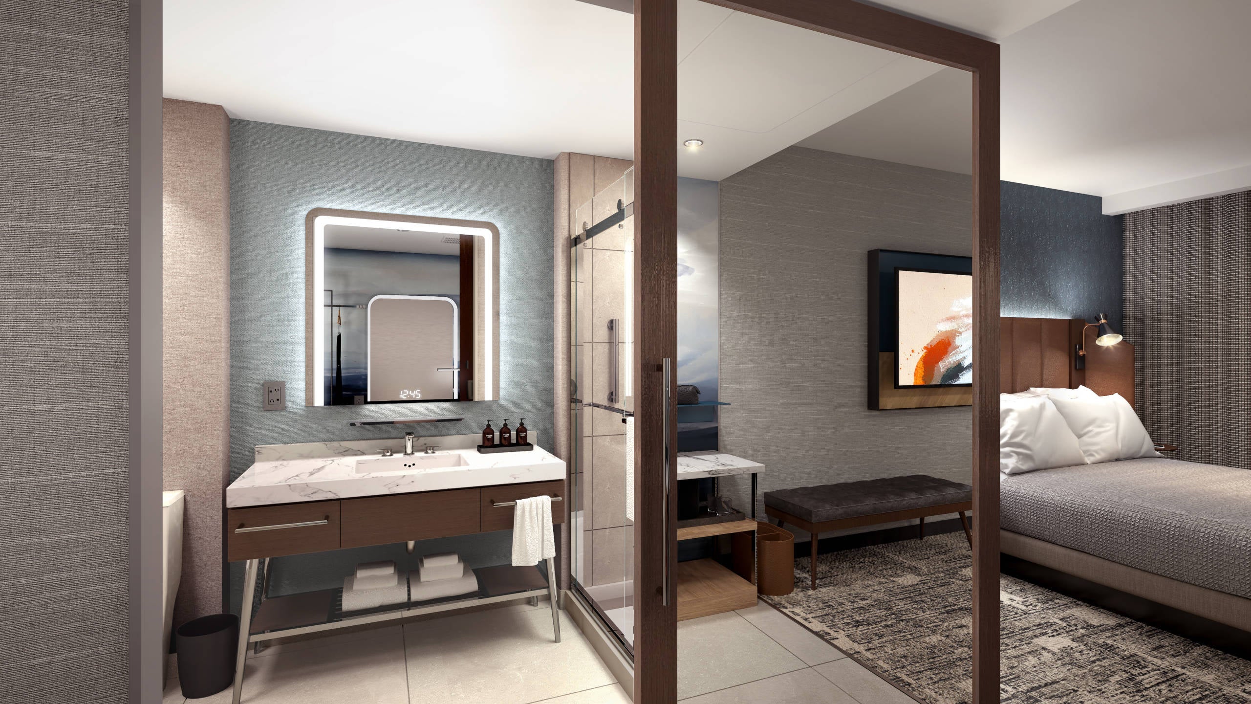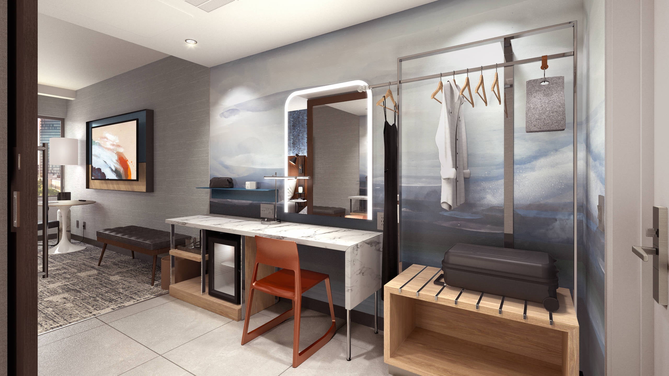In a guest room, travelers can expect oversized bathrooms featuring mirrors with built-in Bluetooth speakers, a "Get Ready Zone" that includes a workspace -- necessary for business travelers on the go — and wellness offerings.