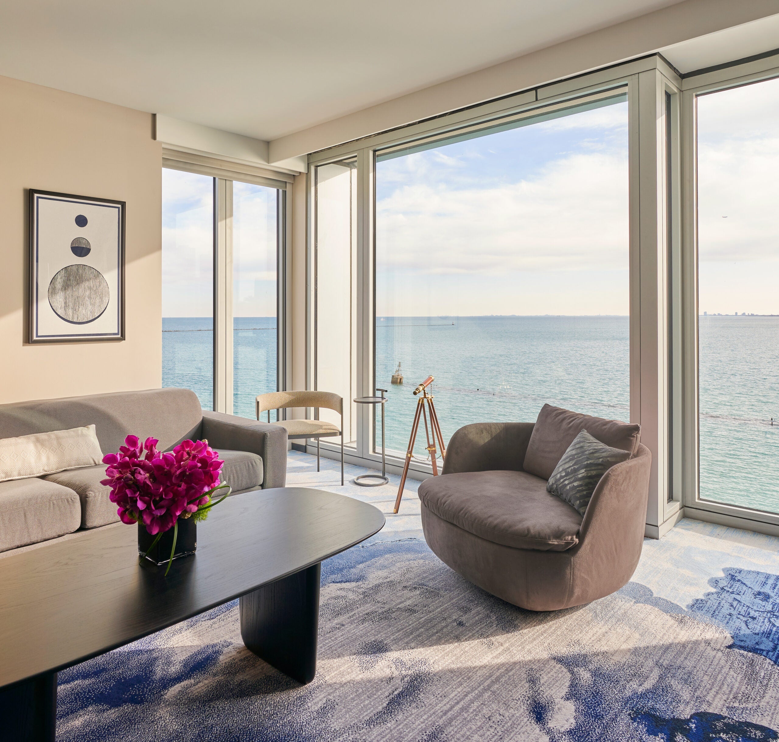 According to Hilton, "Each room boasts floor-to-ceiling windows with unparalleled lake and skyline views, along with corner room upgrades, serenity beds and spacious living room areas. The angled surfaces of each room's window seat create a textured exterior that allows the ever-changing range of light, shadow and color of the lake to reflect within the space, offering a truly unique perspective for locals and out of towners alike."