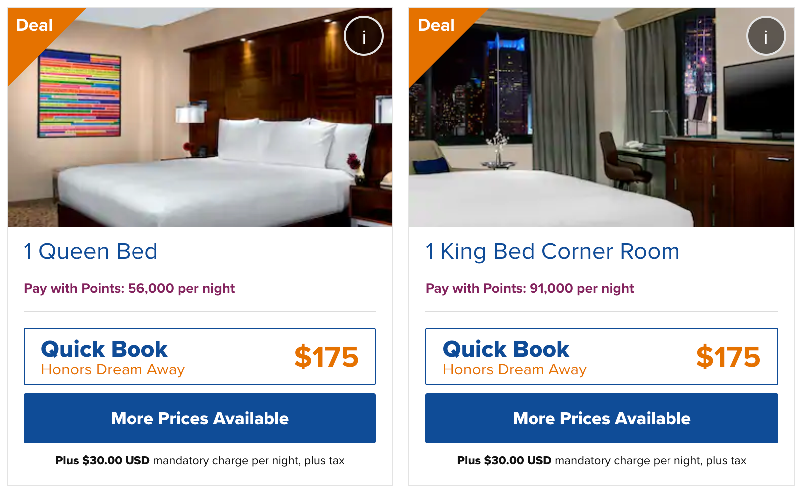 The Millennium Times Square, about three blocks away, can be booked from 29,000 points per night, for example, while the Hampton Inn Manhattan/Times Square Central, just one block south, is available starting at 30,000 points.