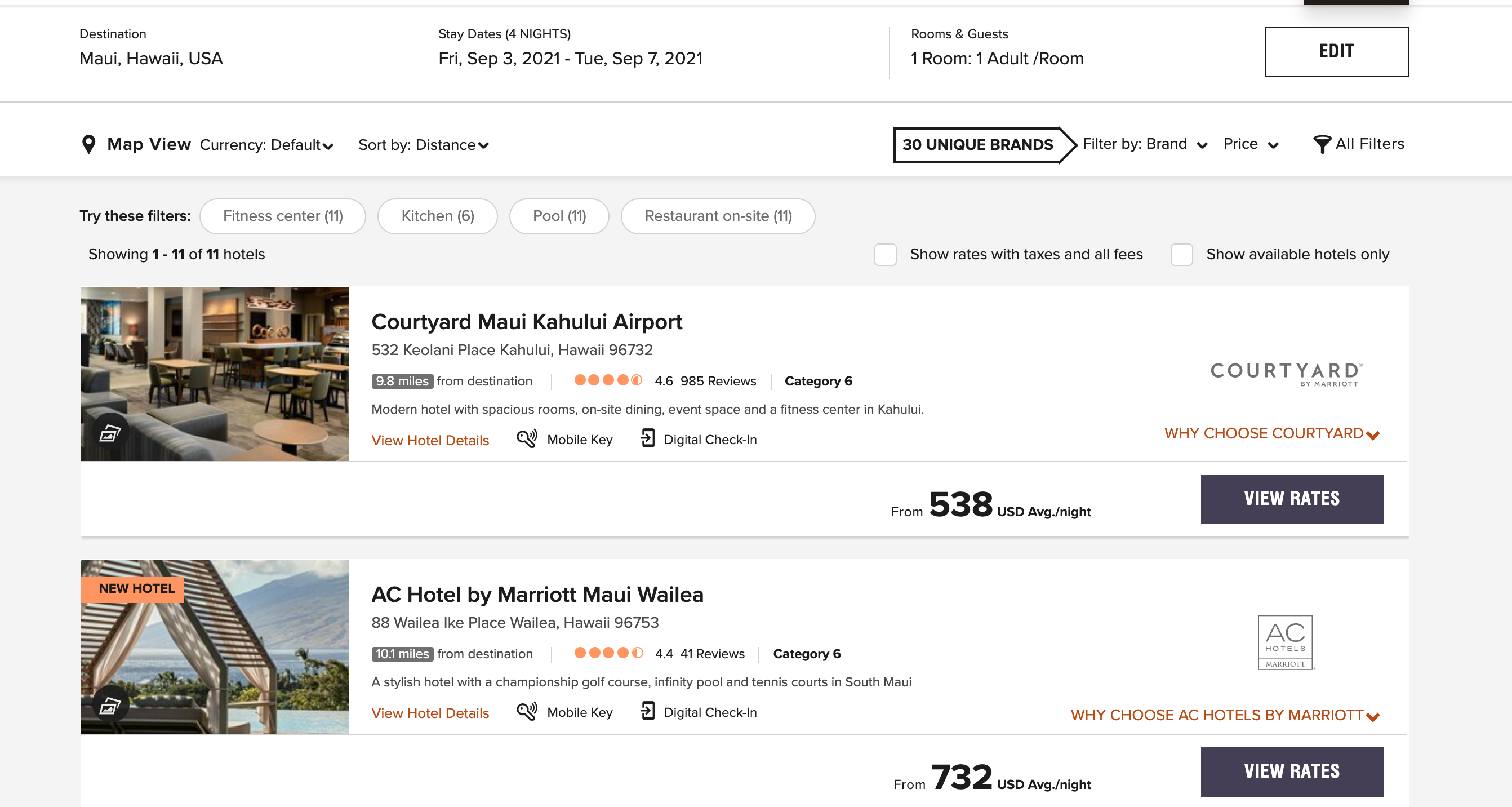 I looked at rates for September in Maui and most of the major resorts started at $500 a night before resort fees. The Sheraton Maui Resort & Spa started at more than $700 a night. The Ritz-Carlton was asking more than $1,600 a night. Even the airport Courtyard in Maui was more than $538 a night.