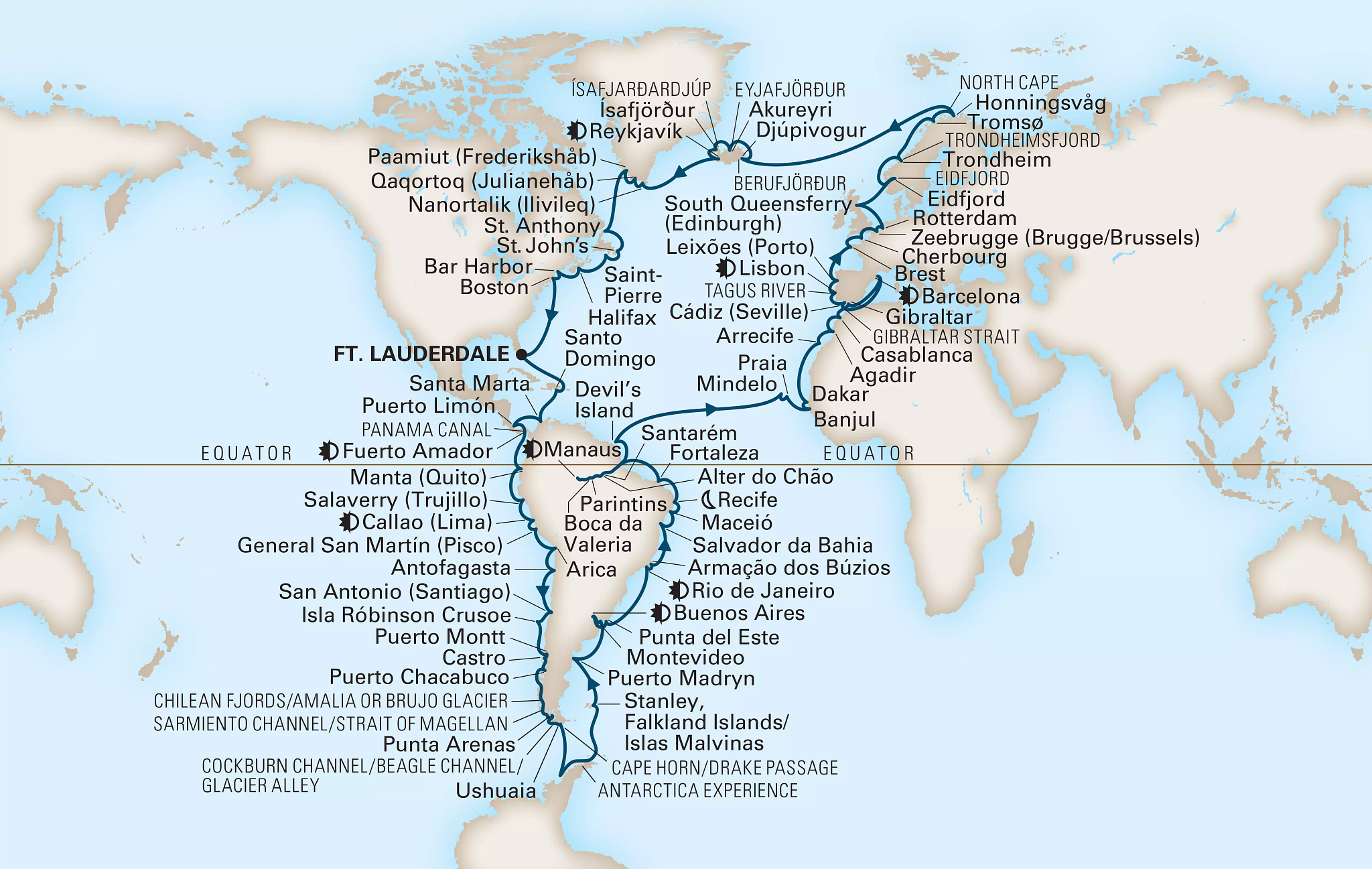 After a crossing of the Atlantic at one of its narrowest points, the voyage will continue with stops in Cape Verde, Gambia, Senegal and Morocco, with a call in the Canary Islands woven in, followed by three weeks of stops in Spain, Portugal, France, Belgium, the Netherlands, the United Kingdom and Norway as the ship works its way north to the Arctic.