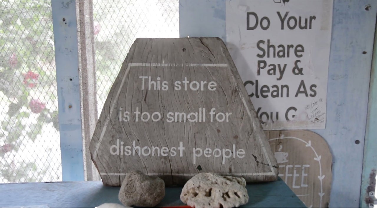 After all, the small, thatched-roof cafe and shop is covered with positive signage, such as "this store is too small for dishonest people," and "get what you need, pay for what you need."