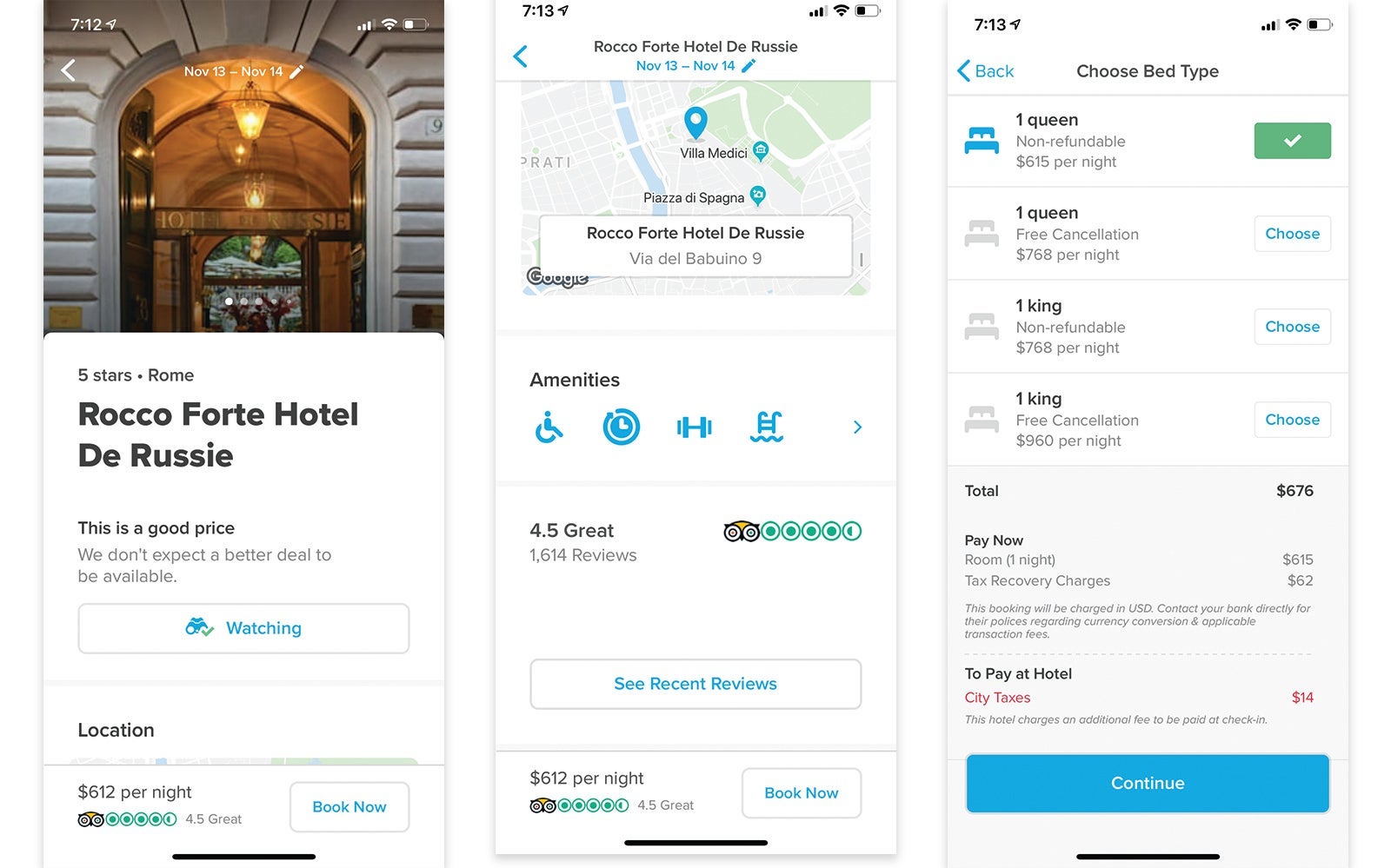 I selected the Hotel de Russie, and Hopper brought me to a page with photos to scroll through, a map showing the hotel's location, icons depicting the amenities and the hotel's TripAdvisor score. For the dates selected (Nov. 6 and 7), it showed a price of $615 per night and Hopper told me "We don't expect a better deal to be available."