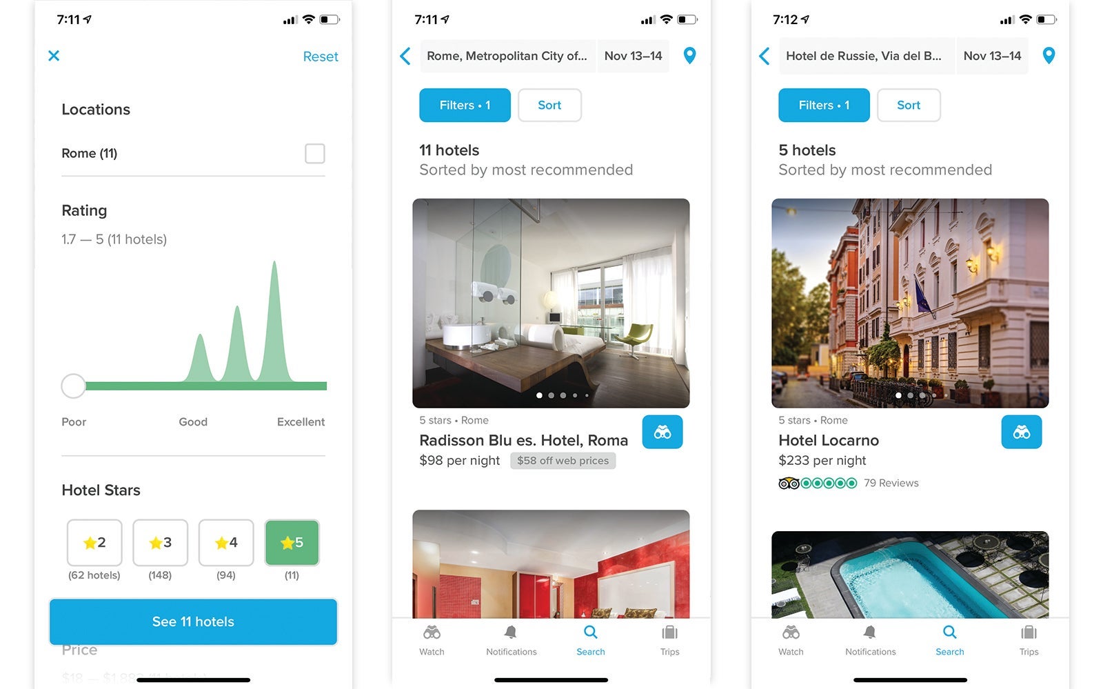 When I tried the same search in Rome and got 636 results. This is when things got a bit tricky. When I filtered for five star hotels, Hopper narrowed it down to just a dozen — and there were some glaring omissions. The St. Regis Rome, the Westin Excelsior and Baglioni Hotel Regina showed up, but the Hassler, the Eden and Rocco Forte's Hotel de Russie did not. But when I searched specifically for the Hotel de Russie, Hopper pulled it up along with four other five-star hotels that didn't appear in my initial search.