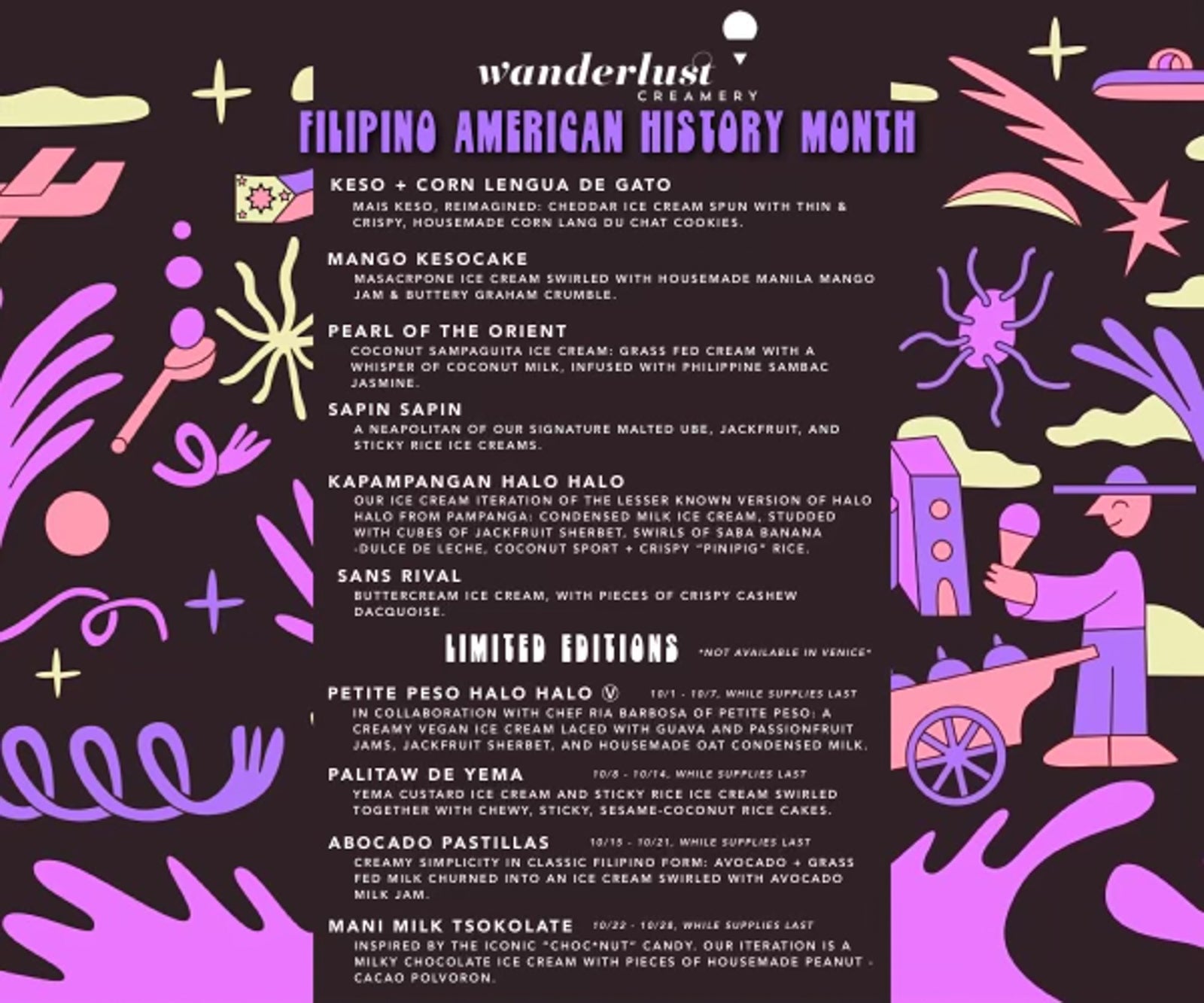 Every October for Filipino American History month, Wanderlust Creamery does a full Filipino seasonal menu which contains a lot of classic Filipino flavors such as ube and and pandan.