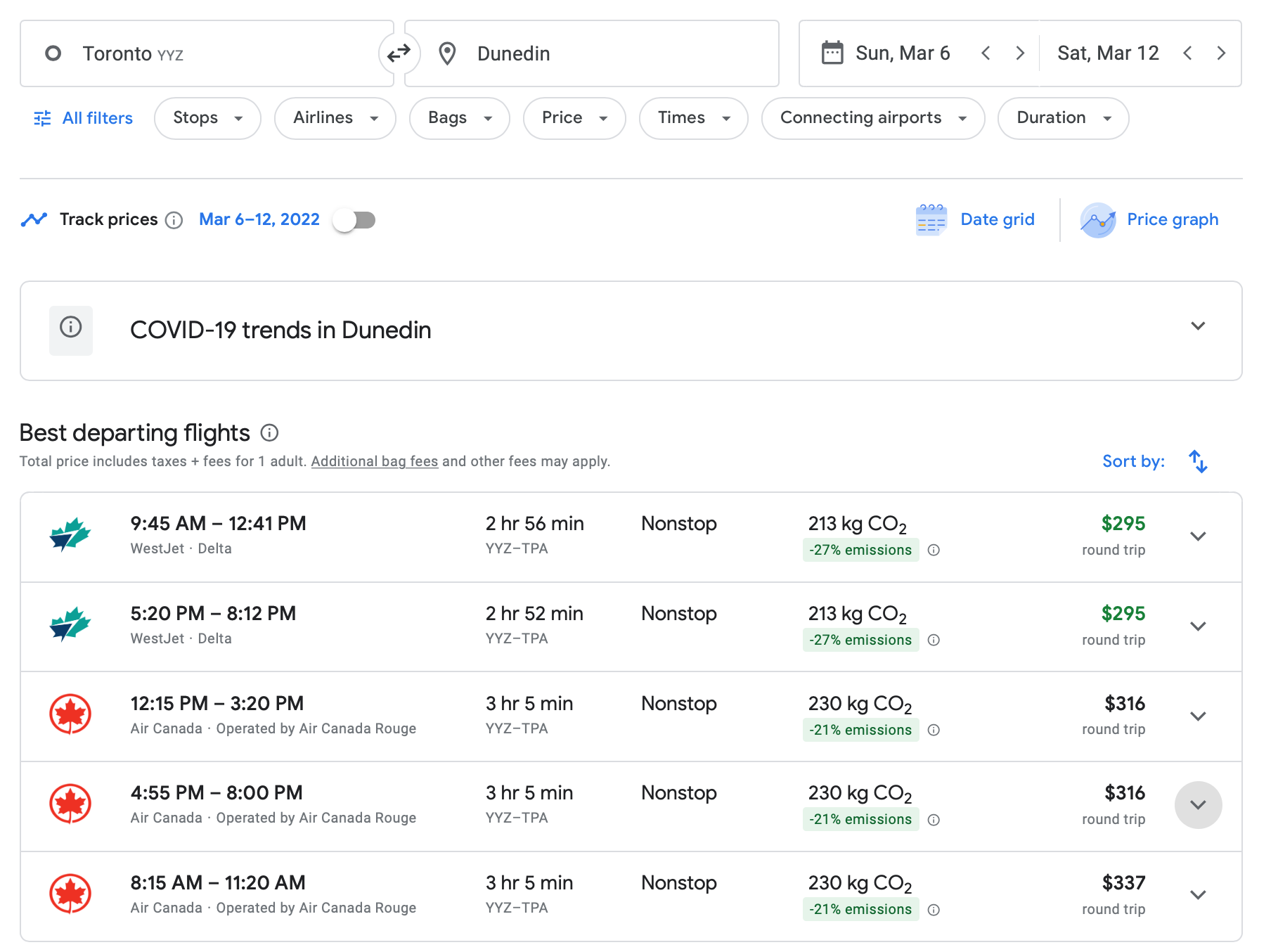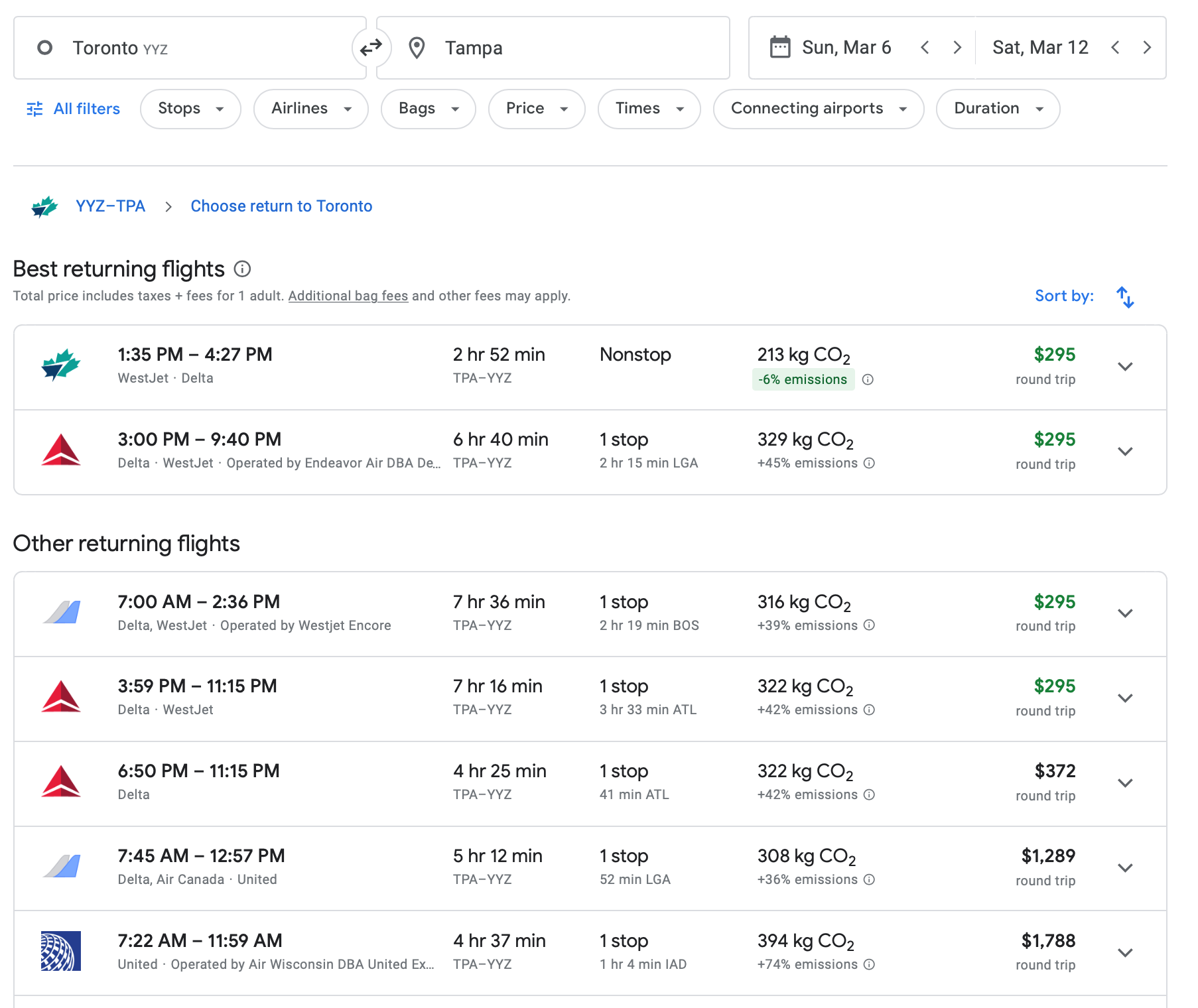 There are several options for Toronto-based fans to follow their team down south in March. There are a number of nonstop flights out of Toronto Pearson International Airport (YYZ) to Tampa via WestJet (a partner of Delta Air Lines) and Air Canada. WestJet flights are as low as $295 round-trip at the moment.