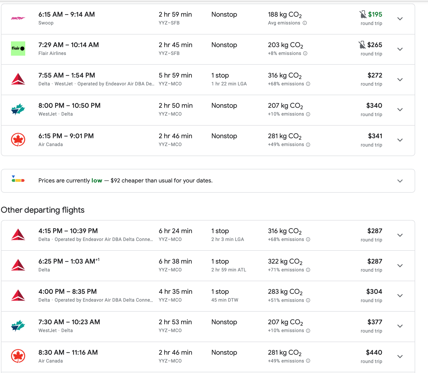 Flights involving Orlando International tend to cost at least $77 more per itinerary — though the location of MCO is much more convenient than than of SFB.