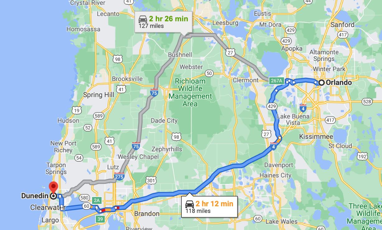 Some snowbirds who come down for spring training may also want to make a visit to Disney World or Universal Orlando. If that's the case, you can break up the trip by traveling first to Orlando International Airport (MCO) or Orlando Sanford International (SFB) and spend a few days at a theme park before making the 107-mile drive west on Interstate 4 to Dunedin.