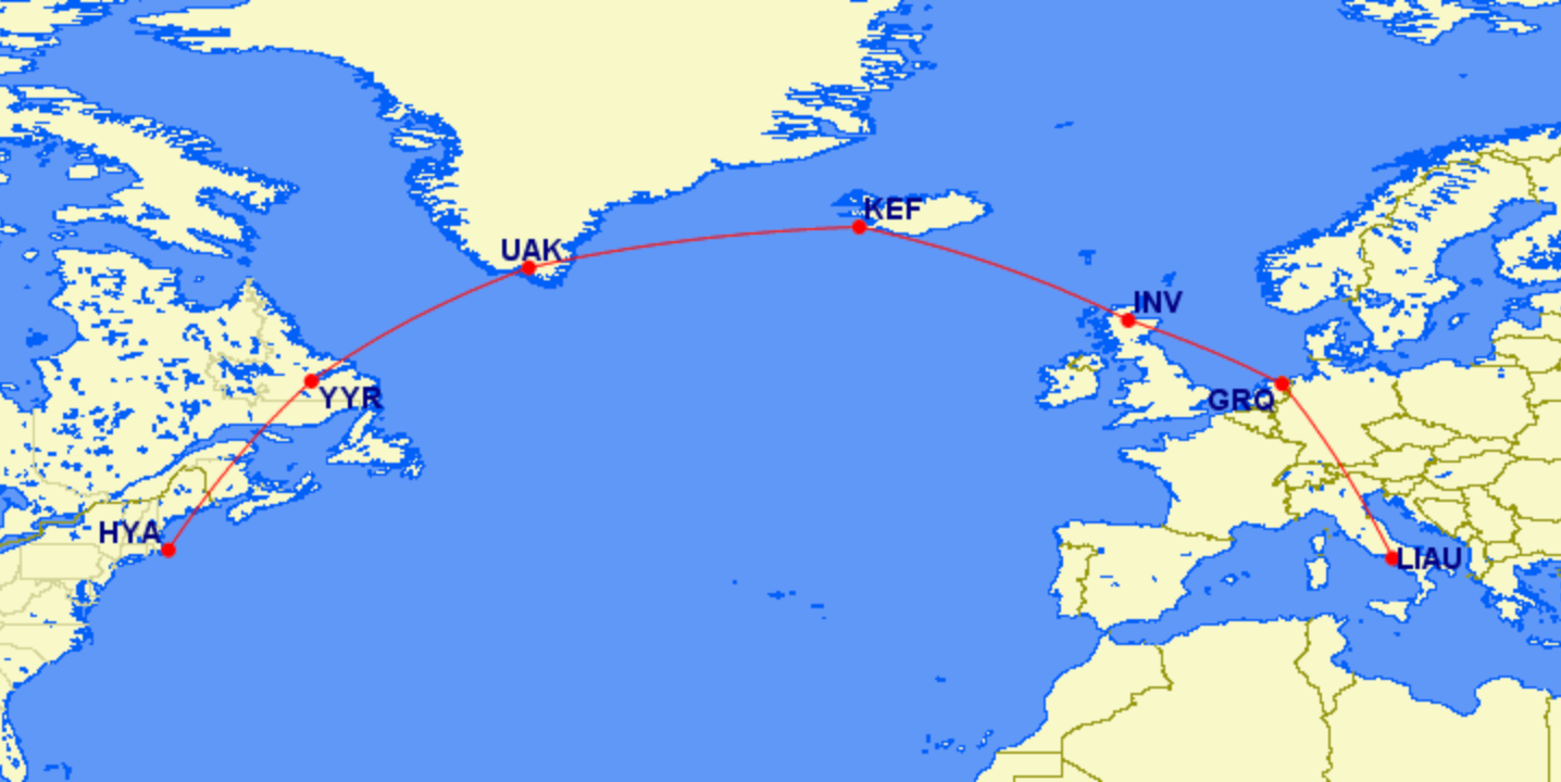 Pascale, along with three other seasoned crew members, made the trip with five stops in three days. Their routing traversed 4,621 miles from Capua to Groningen (GRQ) in the Netherlands, on to Inverness (INV) in Scotland, then Reykjavik (KEF) in Iceland, Narsarsuaq (UAK) in Greenland, Goose Bay (YYR) in Canada, and finally down to Hyannis, where they landed on Sept. 25.