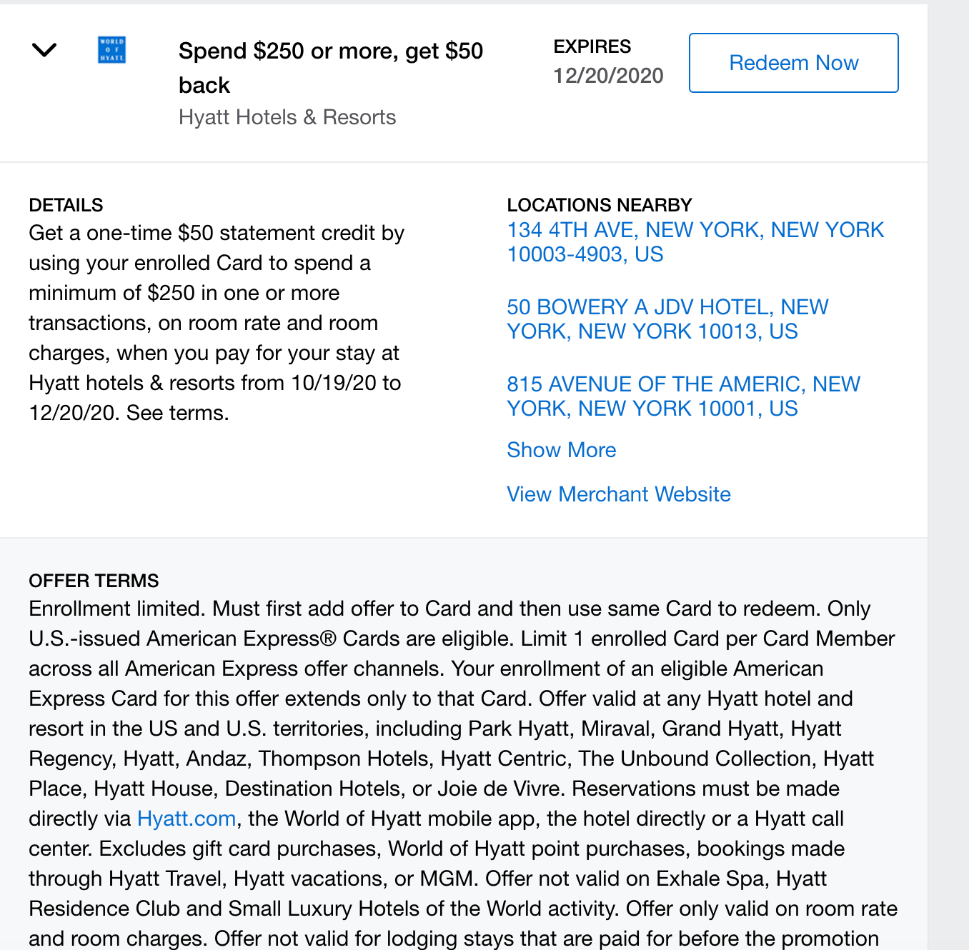 On top of all the bonus points and nights, American Express was offering a $50 statement credit for spending more than $250 at any Hyatt, which I was able to redeem successfully.
