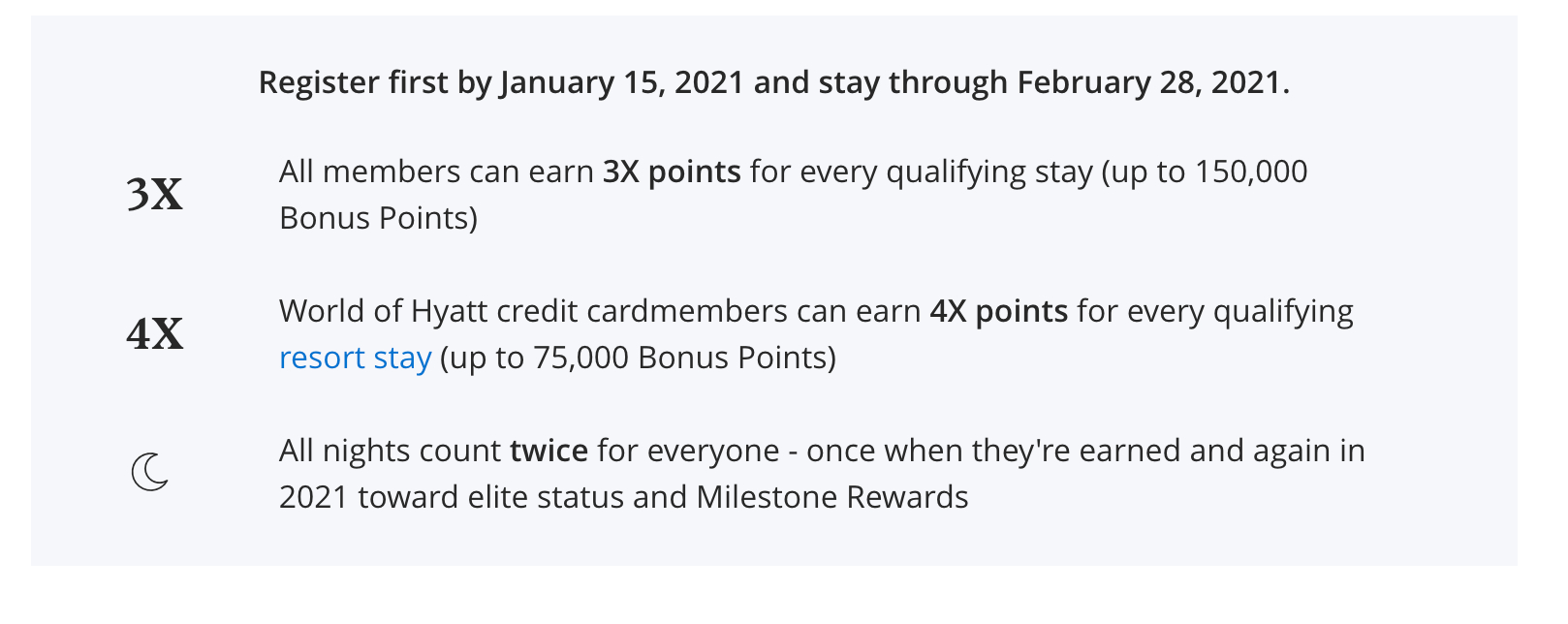This promotion is probably the most generous hotel offer we've seen since the beginning of the pandemic. If you registered by Jan. 15, you can earn triple points for every qualifying stay (up to 150,000 bonus points), while people with the World of Hyatt Credit Card and the legacy Hyatt card can earn 4x points for resort stays (up to 75,000 bonus points). This promotion remains in effect through Feb. 28, which means there's still time to make a move toward earning status if you're already registered.
