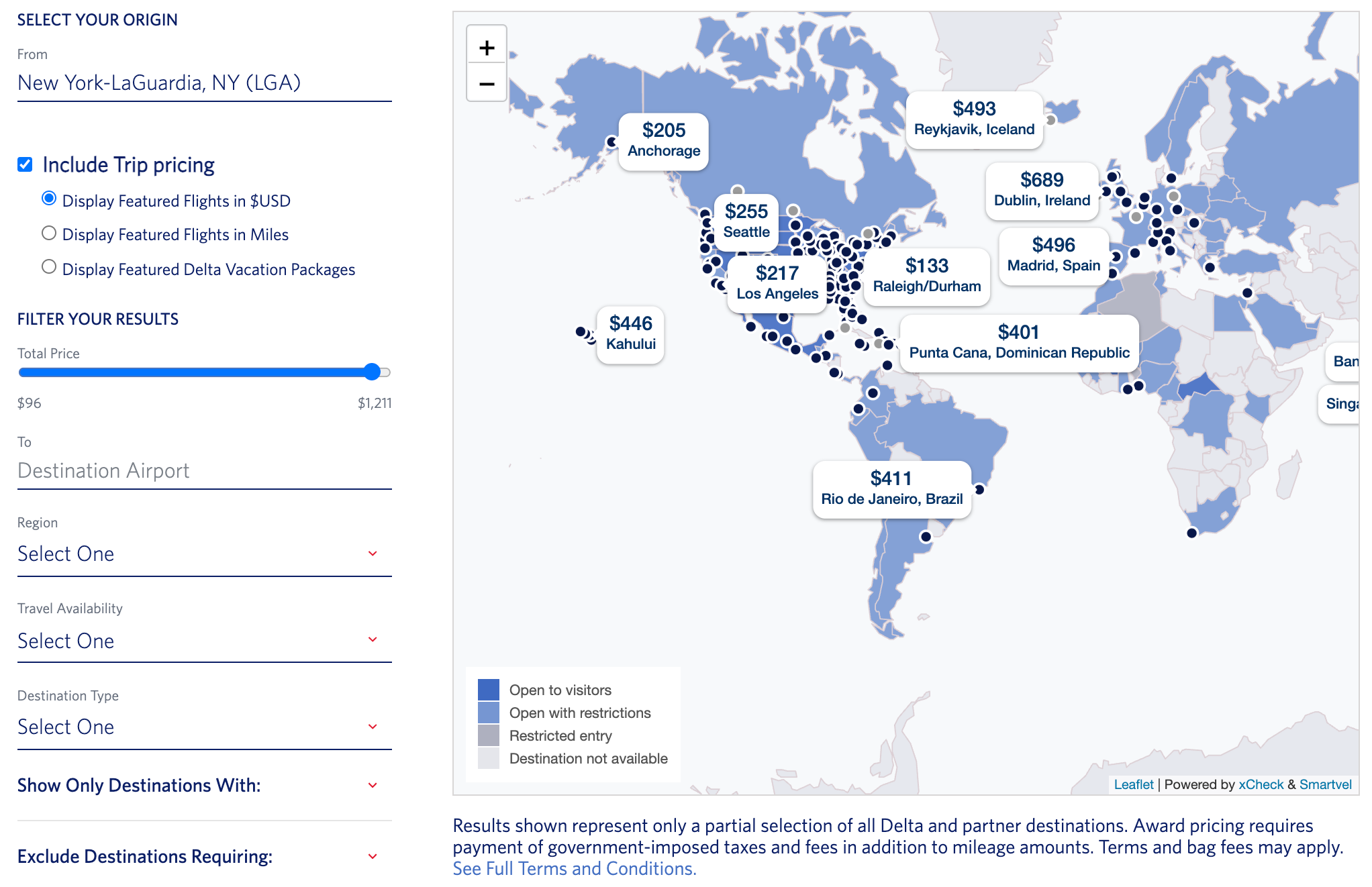 Also on the tech front, all three carriers offer simple map tools that make it easy to see where you're able to travel and what restrictions may apply — you can access American's here, Delta's here and United's here. Delta's even mixes in real-time fares, making it easier to plan a trip based on accessibility and price.