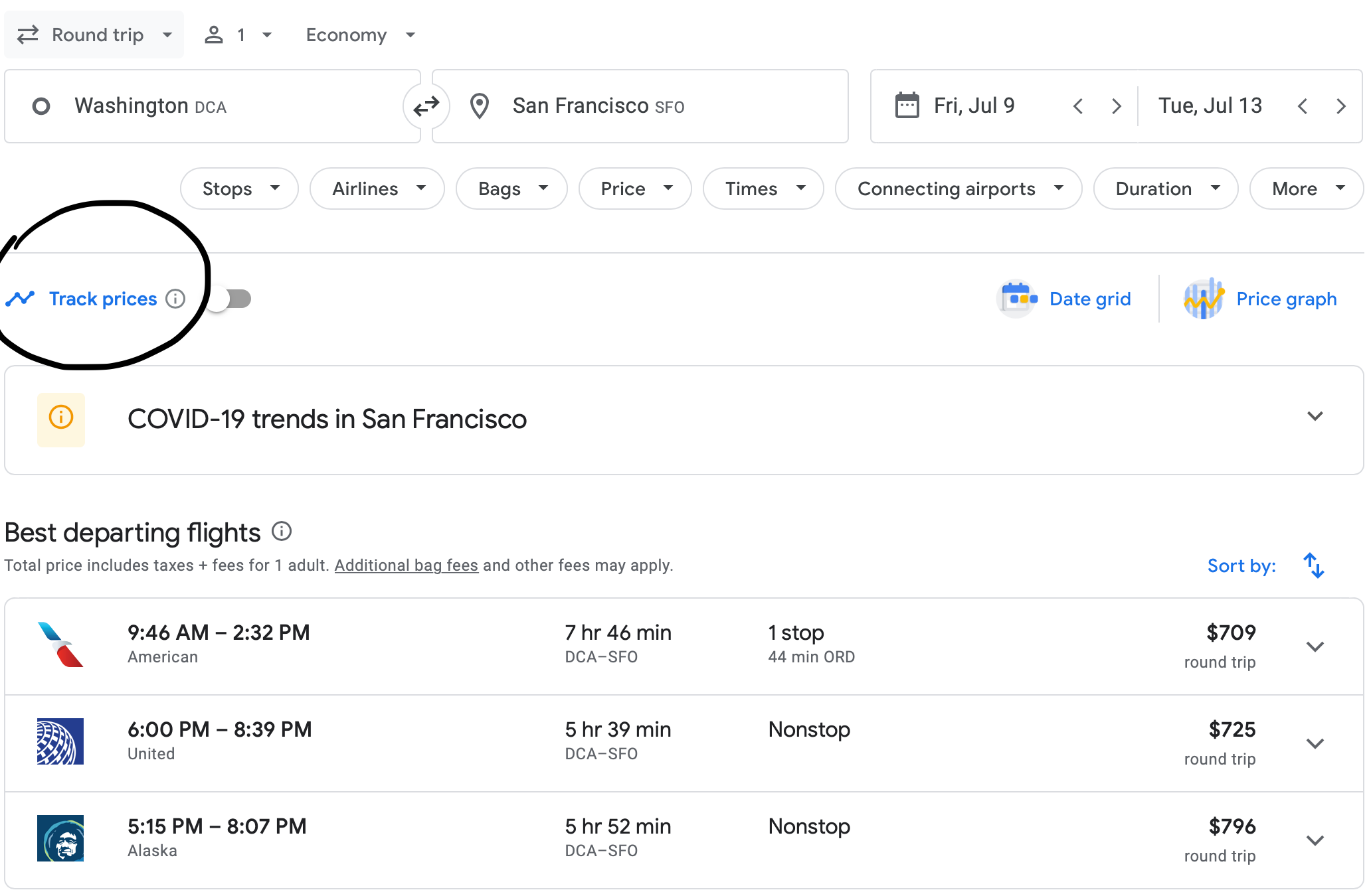 There is a feature that allows you to track your flight prices on Google Flights and be notified when your saved flight changes in price. This is a super helpful tool when flights are getting expensive as travel resumes.