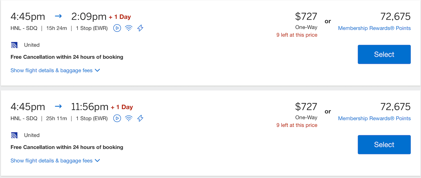 Being points rich and cash poor, I decided to use my Google Flights research and then search the American Express Travel portal to see if I could avoid using cash.