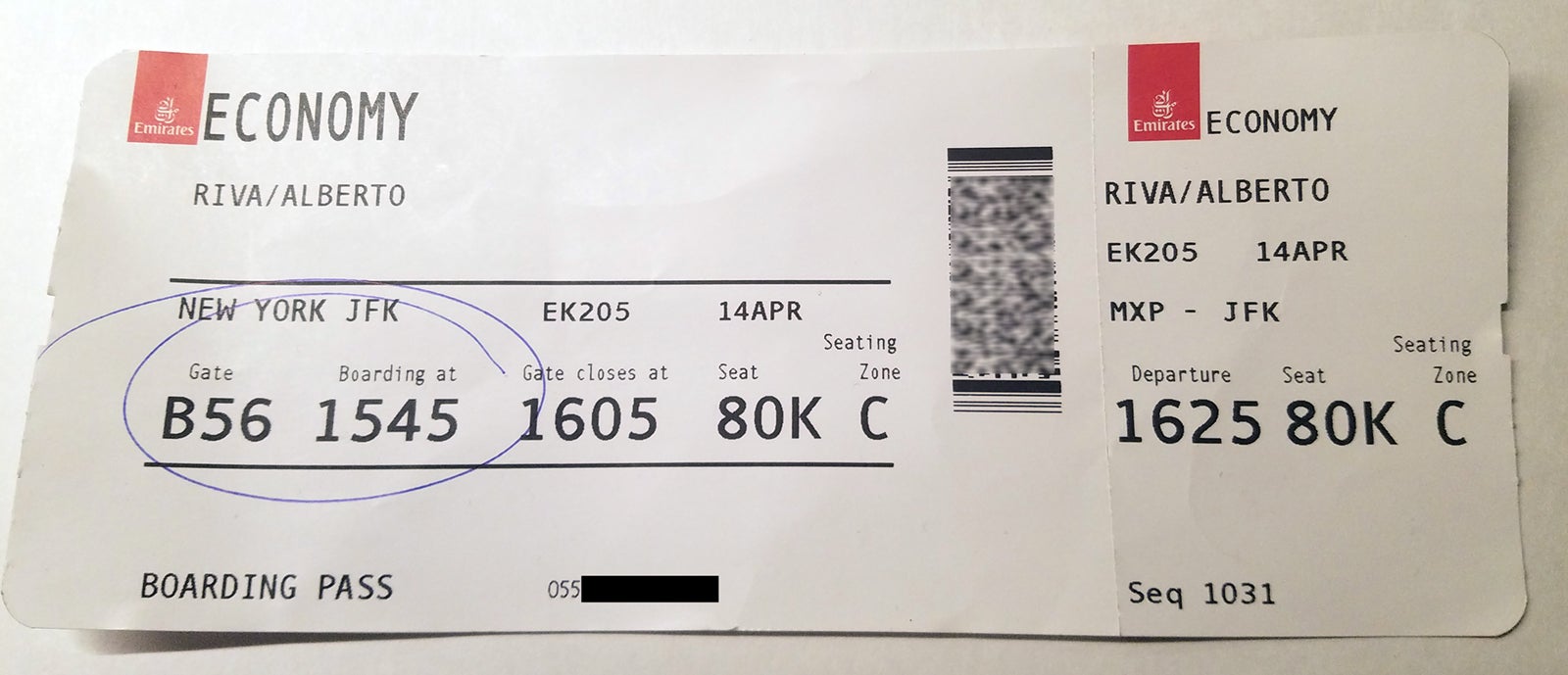 I was handed a new boarding pass with a seat assigned in an ominously high row number, and ran. EK205 was to close boarding in just minutes. (See that 055 number? 055 means my ticket was issued by Alitalia. This would prove to be a key detail.)
