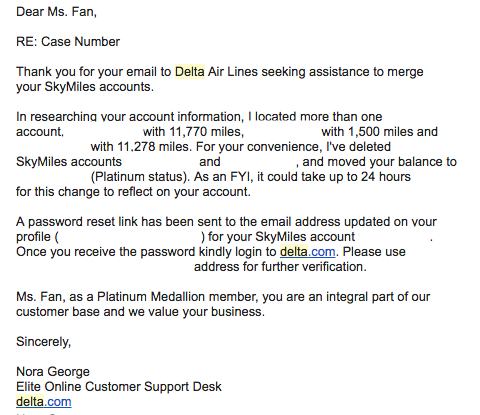 All in all, I found the process of working with Delta's customer service to be a very pleasant surprise. Getting a hold of a live person who could help was very straightforward, and she was prompt and efficient. Furthermore, both her follow-up as well as the automated notification system kept me informed and updated throughout the process, which I appreciated very much. And, thanks to her efforts, as well as that random email which made it through my stringent inbox filters, I now have 27,275 SkyMiles in an account which previously had 1,500 just last week. Thank you, Delta and Nora!