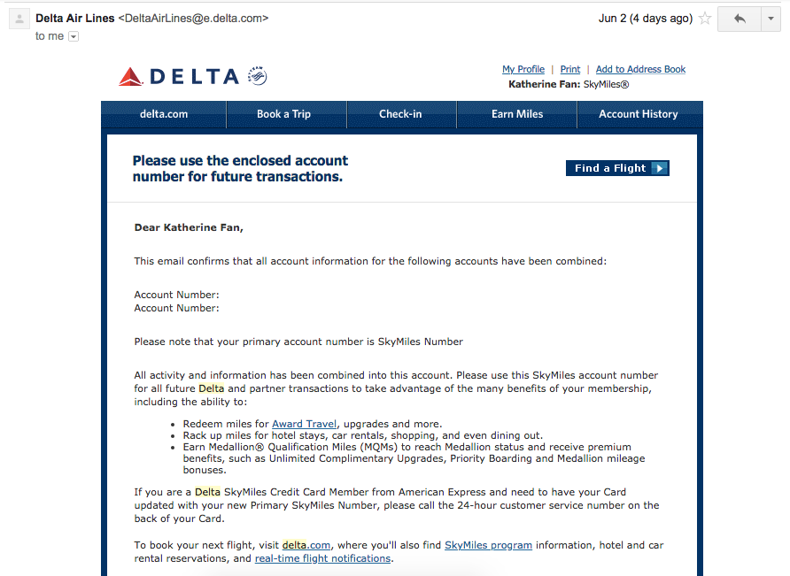 As soon as I opened the email, I knew what had happened: The message was addressed to a former version of me, prior to a legal name change several years ago, and had been forwarded from an old email address. The name difference also explained why I hadn't found my previous Delta SkyMiles account number when my company last tried to book a Delta flight for me, which resulted in a new SkyMiles account.