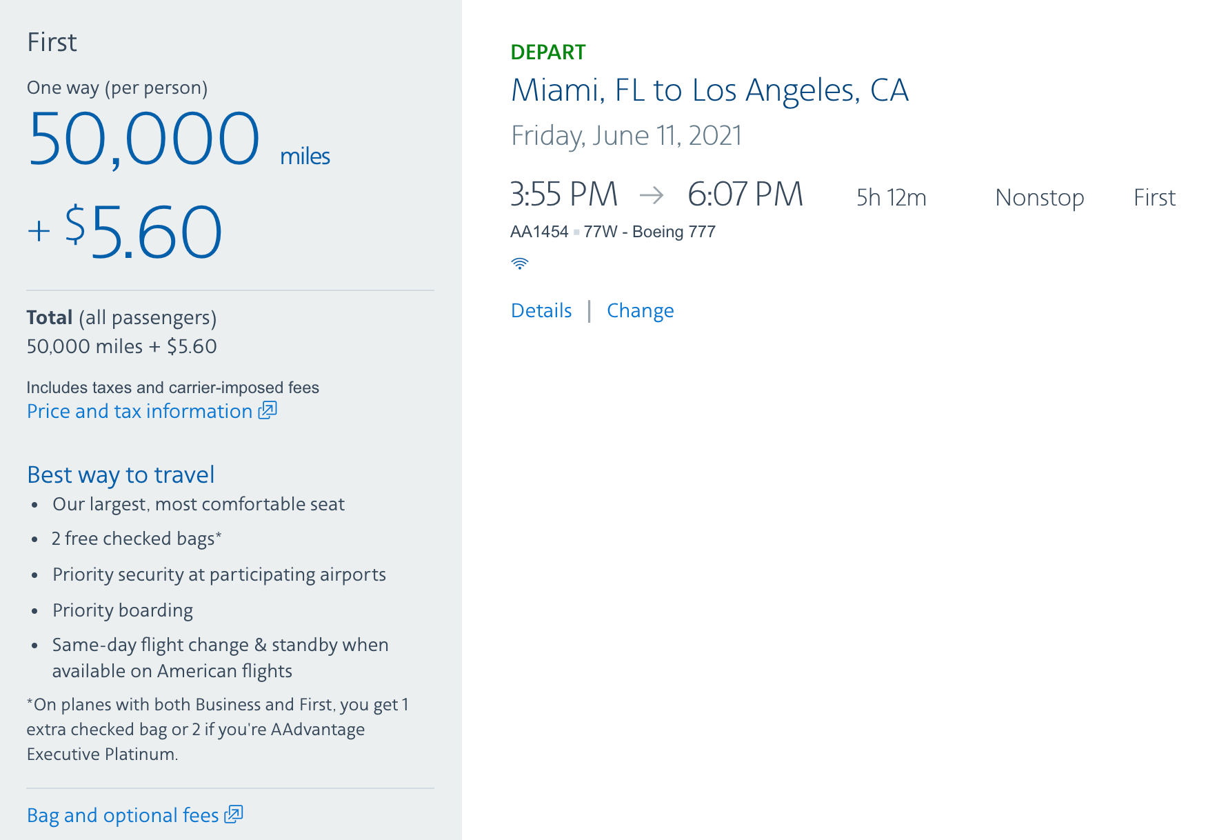 While JetBlue is an Amex Membership Rewards transfer partner and has an award-winning product in business class, I knew American operated its Boeing 777-300ER, equipped with "Flagship First" (the carrier's best product) from Miami (MIA to Los Angeles (LAX) and there was award space for two available, which was the clear winner in my eyes.