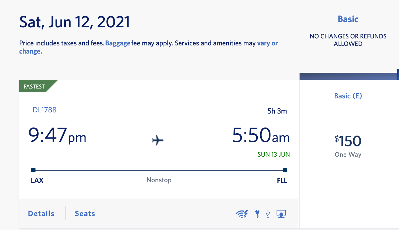 For our flight home the next day, the cheapest nonstop option was a Delta basic economy fare, which also happened to be a redeye flight. Mom was on board (no pun intended) and didn't mind the short overnight flight. I could have paid $150 per person for a one-way ticket, which is about average for this coast-to-coast route.