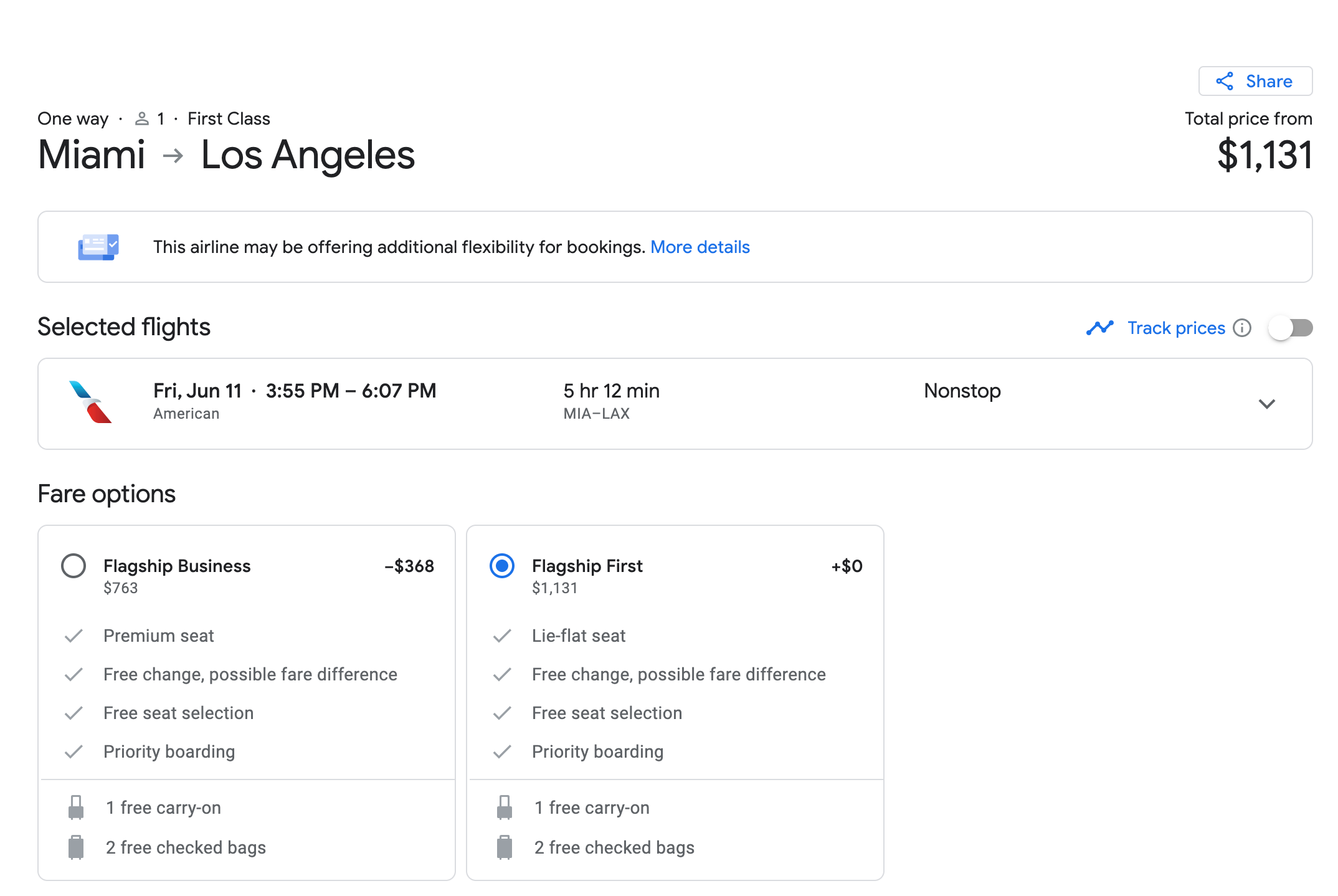 The cash rate for our one-way jaunt in style from Miami (MIA) to Los Angeles (LAX) in Flagship First priced out at $1,131.