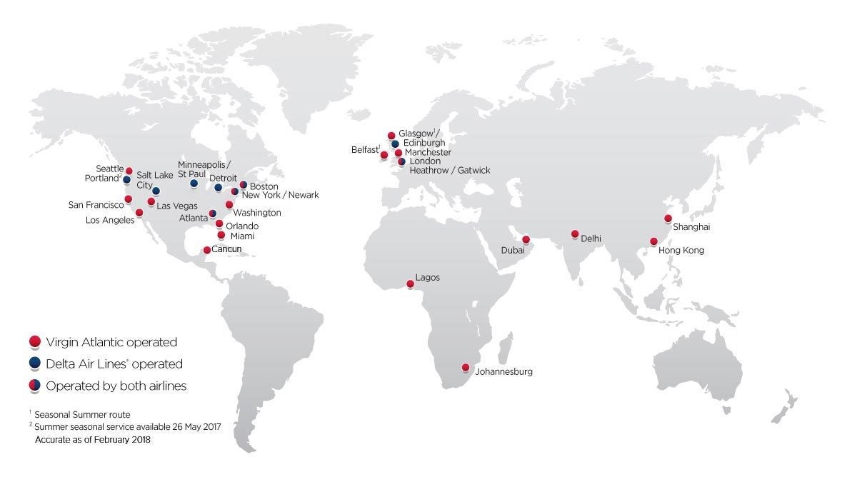 Virgin Atlantic uses different colors to convey information, for example to differentiate between destinations served by its own planes or through codeshare agreements.