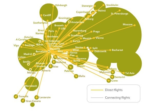 Exact geographical features or even landmass contours may even be absent altogether from route maps. This is the case, for example, of the map Vueling uses on its website, as opposed to the inflight magazine: