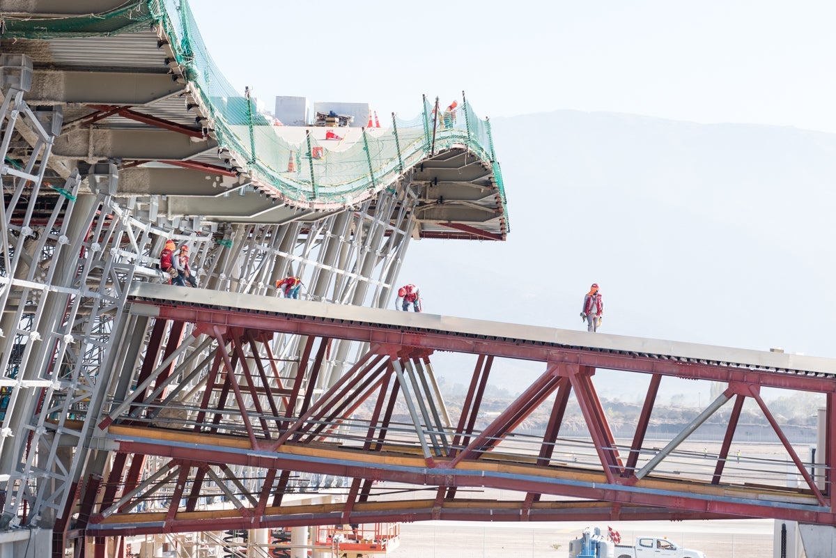 Watching an airport come together is almost like taking in a performance of Cirque Du Soleil, with choreographed and harnessed workers wherever you look. Walking back to the older terminal, I'm struck by the fact that what makes this building so incredible is the engineering behind it and the thousands of details that no one can actually see: the joints and structures that will keep it — and passengers — safe should an earthquake happen. In that respect, at least, Nuevo Pudahuel is a pure expression of form and function coming together artfully.