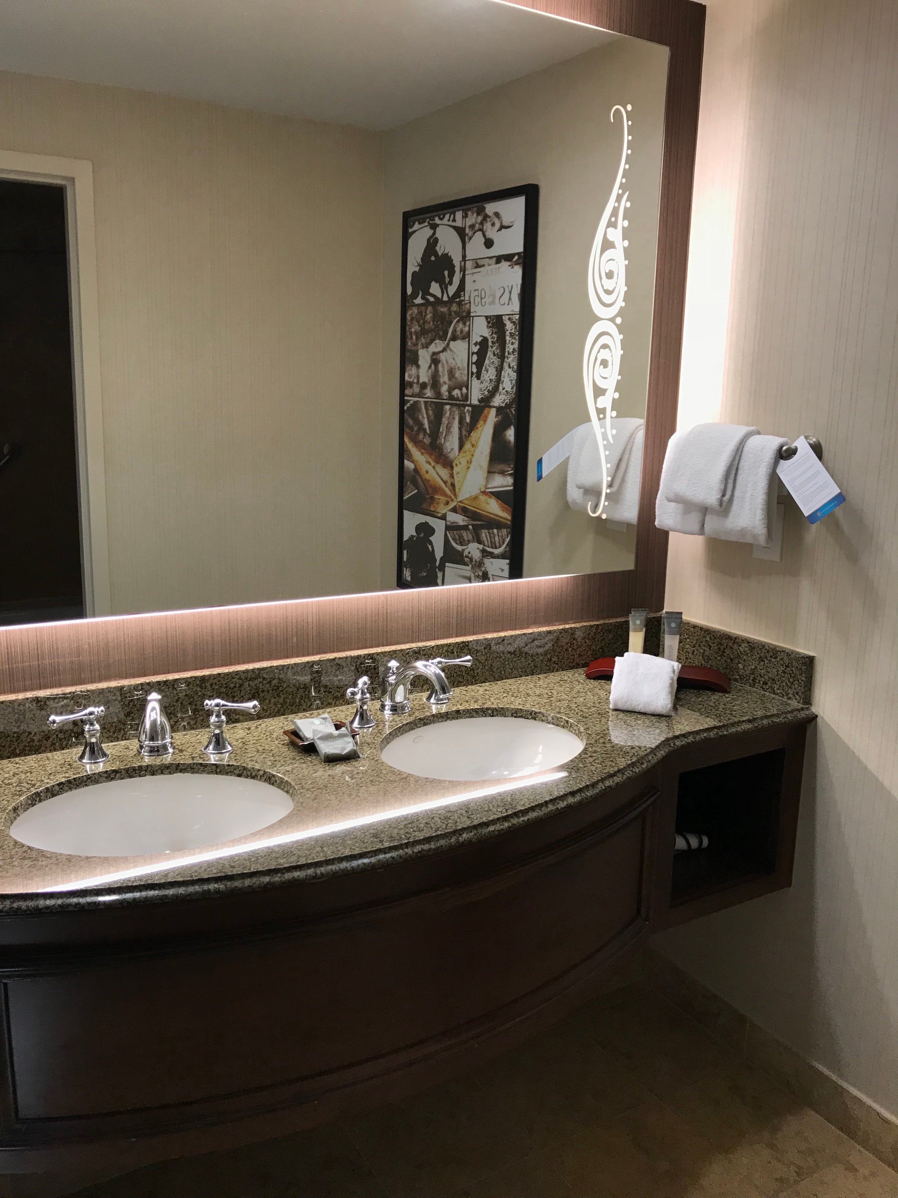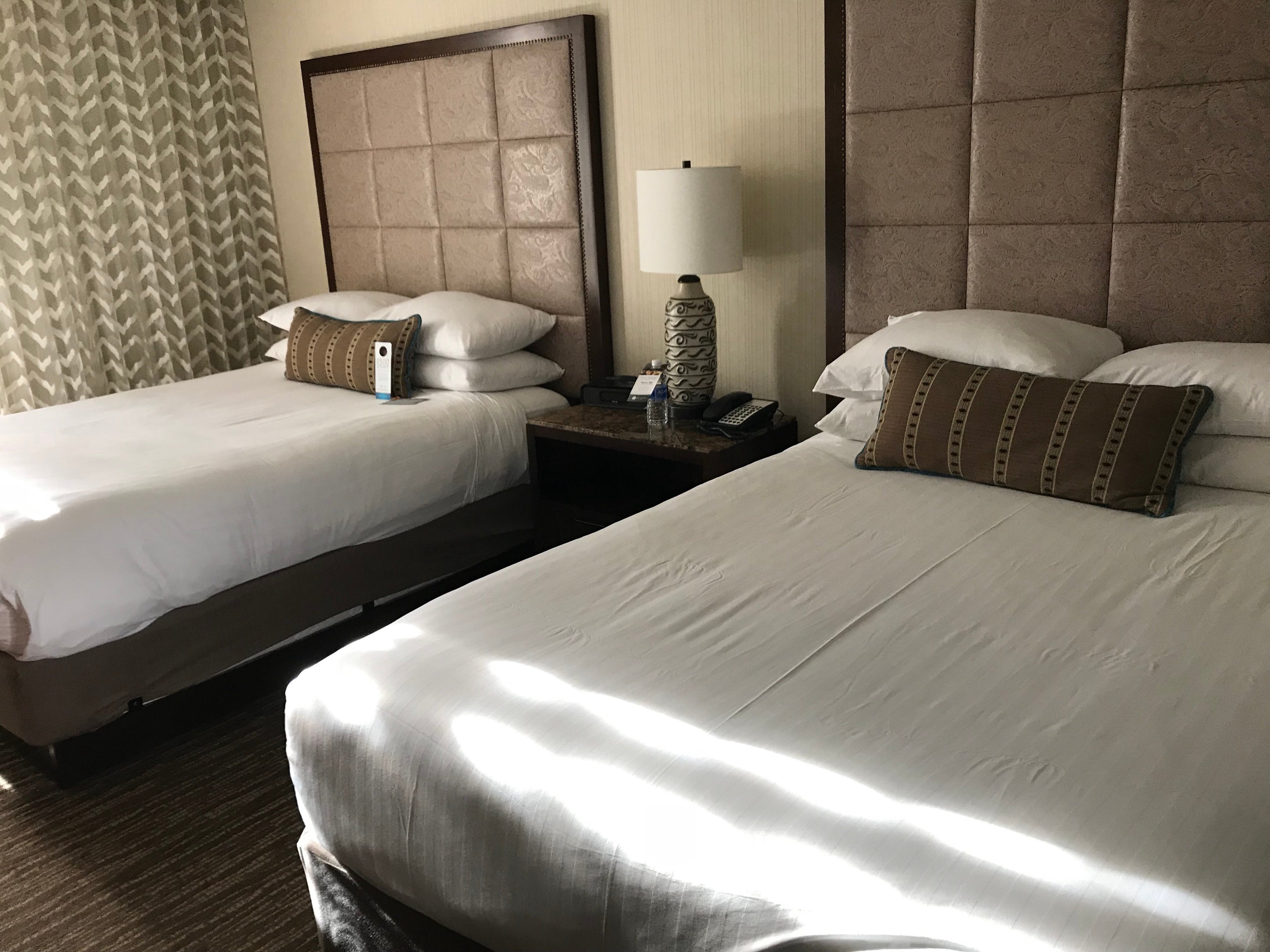 Our room was on the fourth floor and was a standard room with two queen beds, a double vanity with a separate room for the toilet and traditional tub/shower combo. It was indeed a standard room, but one that was totally adequate and comfortable for our family of four for the night. The only hitch was that one of the two elevators that served this section of the hotel was broken for the duration of our stay which led to some elevator crowding at times.