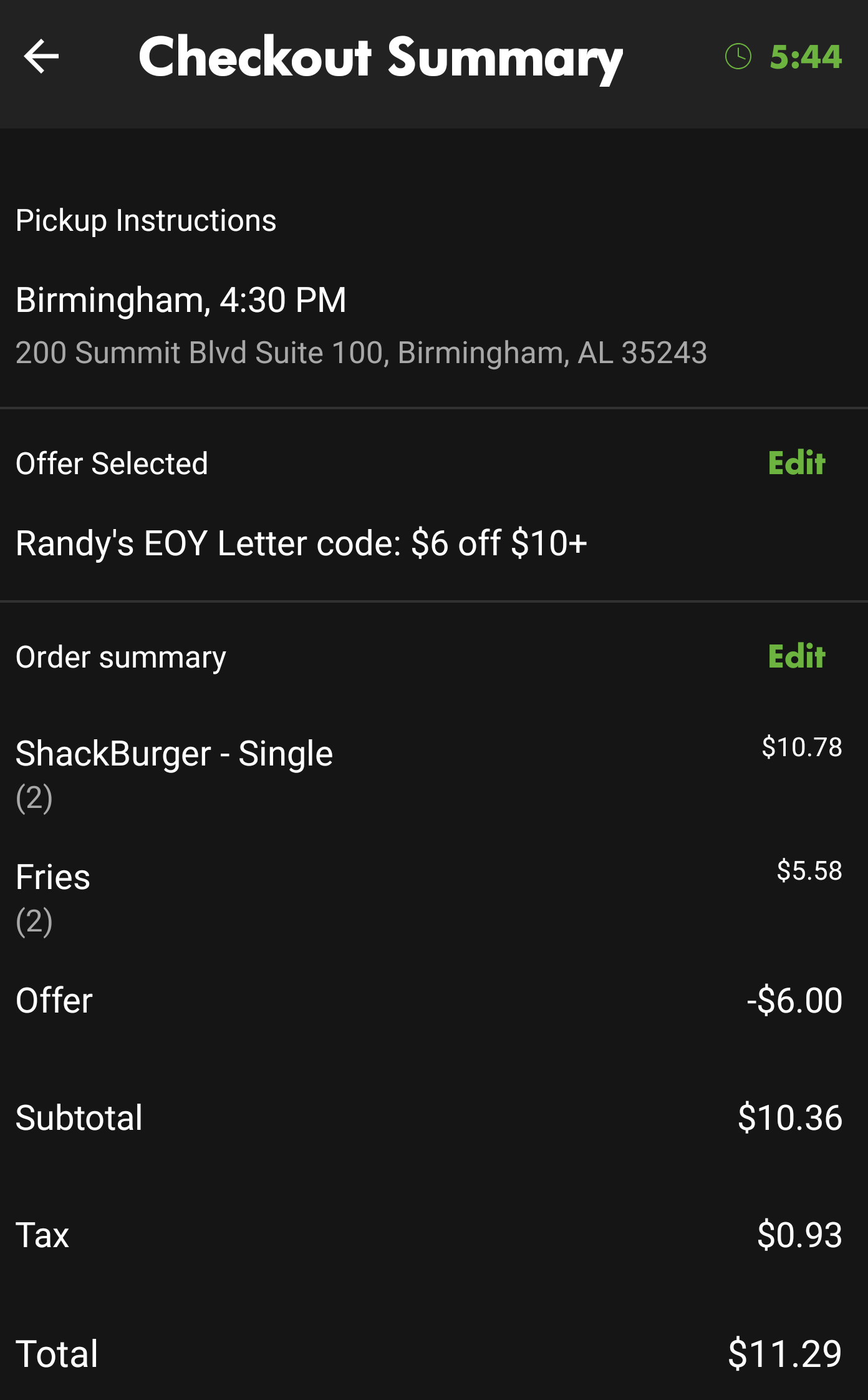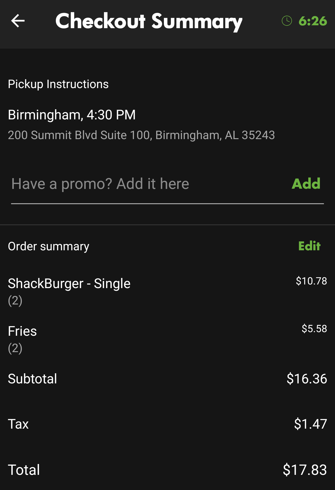 But, you can make the promotion even better if you haven't yet used the $10 monthly dining credit that comes with the American Express® Gold Card. In this case, you can get a meal of two ShackBurger singles and two fries for just $11.29 — or effectively $1.29 after the $10 monthly dining credit. Note that the exact price will vary based on state and local taxes.